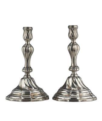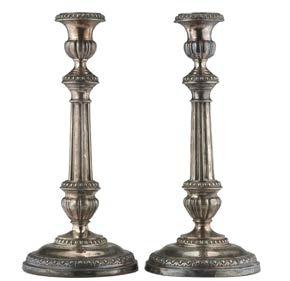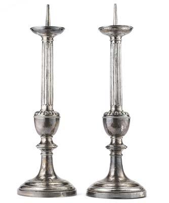 Coppia di candelieri in argento con fusto a colonna scanalata decorata a motivi baccellati e ovoli, basi circolari appesantite. Torino, secolo XIX (g lordi 720) (h. cm 30) (difetti)