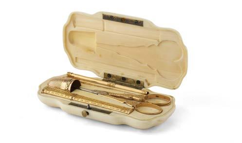 Etui con contenitore in avorio di forma sagomata composto da un ditale, un punteruolo, uno stiletto, un paio di forbici e un porta-aghi in oro e metallo, ogni pezzo con decorazioni oreali e fogliacee in rilievo (g netti 10) (cm 11x6) (difetti)