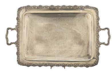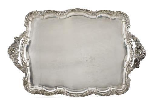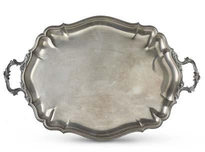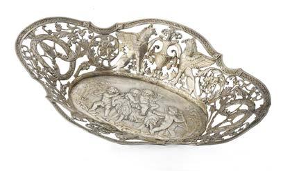 Cesto in argento con bordura traforata incisa e sbalzata a grifoni, vasi e volute, cavetto decorato con baccanale. Centro Europa, inizio secolo XX (g 420) (cm 36,5x7,5x26) (difetti)