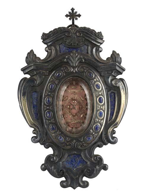 Reliquiario di Santi con cornice in argento inciso con decoro a tempietto con volute e valva di conchiglia, inserti in cabochon di lapislazzuli. Roma, secolo XIX. Argentiere Giuseppe Salvi (attivo tra il 1868-1870) (cm 20x13) (difetti) Il marchio G176S presente sia al retto che al verso della cornice in argento è stato trovato su diversi argenti tra cui una Rosa d’Oro in vermeil di papa Pio IX conservata nei Musei Vaticani ed un calice del Santuario di S. Maria a Genazzano datato 1874.