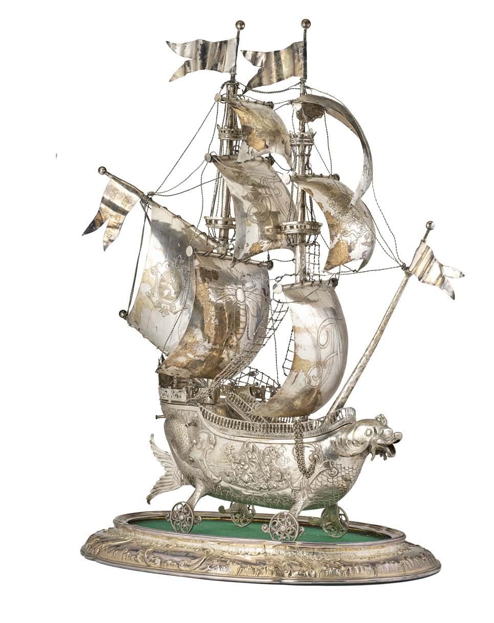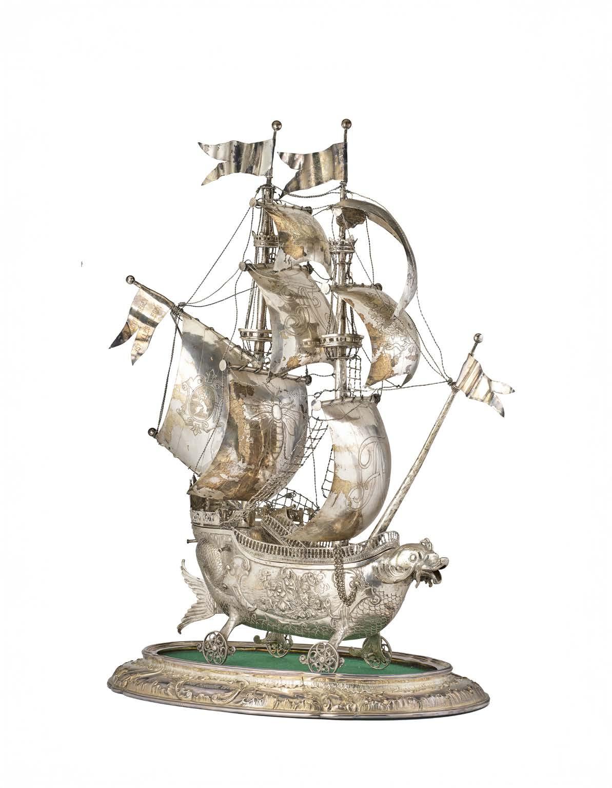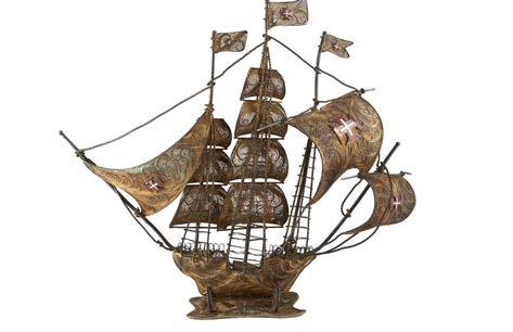 Modello di caravella spagnola a tutto tondo in ligrana d’argento dorato e smalti policromi. Olanda, secolo XIX (g 500) (cm 36x32) (difetti)