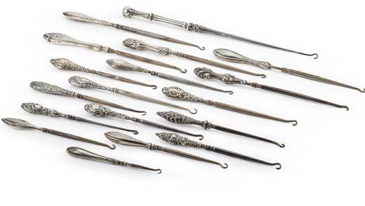 Collezione di diciotto tiralacci con manici sagomati in argento e lamina d’argento. Punzoni ed epoche differenti, secolo XIX-XX (h. max cm 32,5) (difetti)