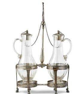 Oliera in argento con sostegni a pilastrini scanalati su piedi ferini e fasce traforate, sostegno con presa trilobata. Stato Ponti cio, inizio secolo XIX (g 530). Doppia ampolla ad un’ansa in vetro e tappi con catenella in argento probabilmente adattati in epoca successiva (h. cm 30,5) (difetti)