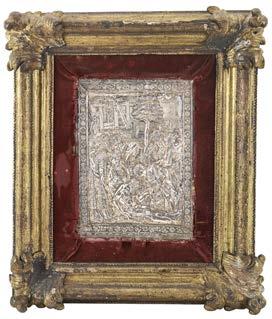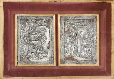 Arte dell’inizio del secolo XIX. Due lastre in argento rafguranti l’Annunciazione e la Natività entro teca di epoca successiva (cm 35x50) (difetti e rotture)