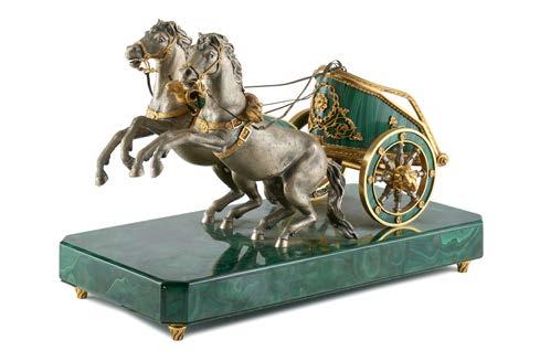 Biga in argento dorato e malachite trainata da due cavalli rampanti su base ottagonale in malachite, piedi a torchon. Argentiere del secolo XX (cm 26,5x18x13) (difetti)
