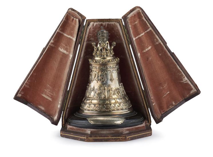 Campanello da funzioni in metallo argentato dal modello della grande campana della Basilica di San Pietro ad opera dell’orafo Luigi Valadier e fusa nel 1785.