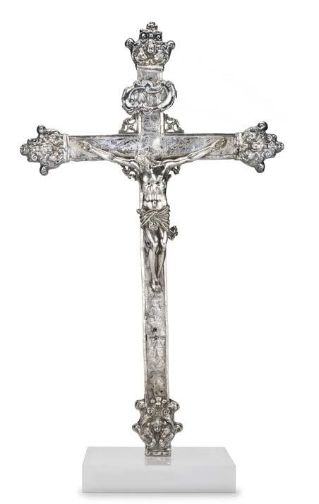 Arte napoletana del secolo XVIII-XIX. Cristo croci sso, scultura in argento tutto tondo con croce incisa a motivi vegetali e puntali decorati a sbalzo con putti (h. cm 74,5x45) montata su base in plexiglass di epoca successiva (difetti e restauri)