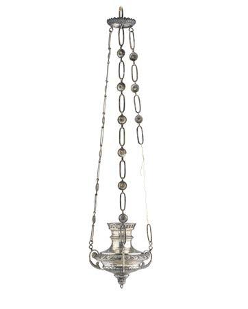 Lampada votiva in argento decorata a foglie d’acanto sbalzate e catene ad anelli sorretta da anse a volute con ori (g 300) (h. cm 54) (difetti, rotture e mancanze)