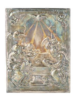 Domenico Grossi (attr.), seconda metà del secolo XVII. “I quattro evangelisti e la colomba dello Spirito Santo”, placca in argento sbalzato e inciso (g 150) (cm 21x16) (difetti)