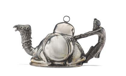 Teiera in argento sbalzato a forma di cammello con ansa a gura orientale con turbante, presa ad anello. Milano, anni ‘70 (g 1080) (cm 25x14) (difetti)
