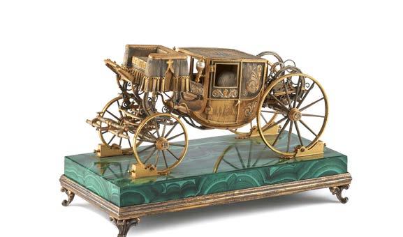 Carrozza in argento dorato su base in malachite poggiante su piedini a ricciolo, lanterne con perle coltivate. Firmata sotto la base Johannes (cm 18,5x9,5x12) (difetti, tracce di colla)