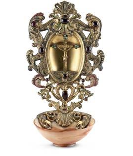 Acquasantiera in rame dorato, inciso, traforato e sbalzato con decoro a volute fogliate centrato da Cristo Croci sso, inserti in cabochon di granati e turchese, vasca in agata striata. Roma, secolo XIX (cm 20x12) (difetti e felatura dell’agata)