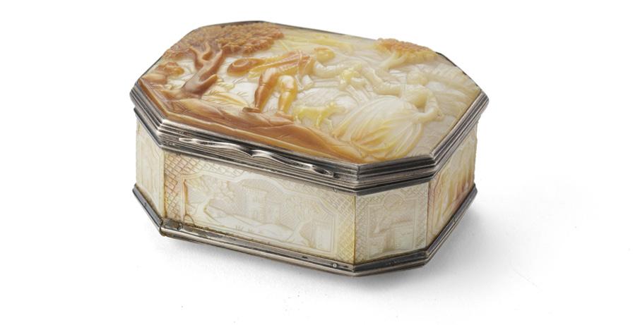 Tabacchiera di forma ottagonale con ghiera e chiusure in argento e vermeil, coperchio, fasce e base in madreperla incisa e intagliata a scene galanti, scene di caccia e paesaggi entro riserve con architetture nella fascia (cm 8x3,5x6,5) (difetti e mancanze)