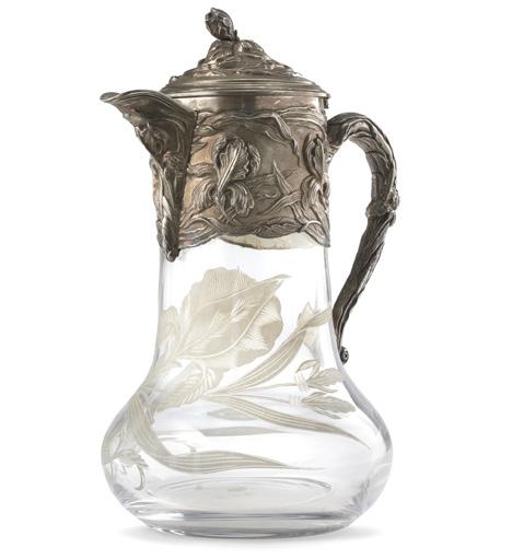Brocca in vetro inciso a motivi vegetali con ghiera e ansa in argento sbalzato a fiori, coperchio incernierato con presa in forma di fiore a tutto tondo (h. cm 28) (difetti)