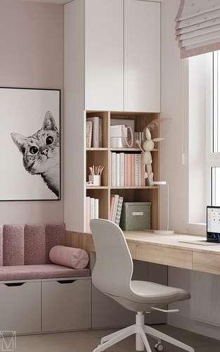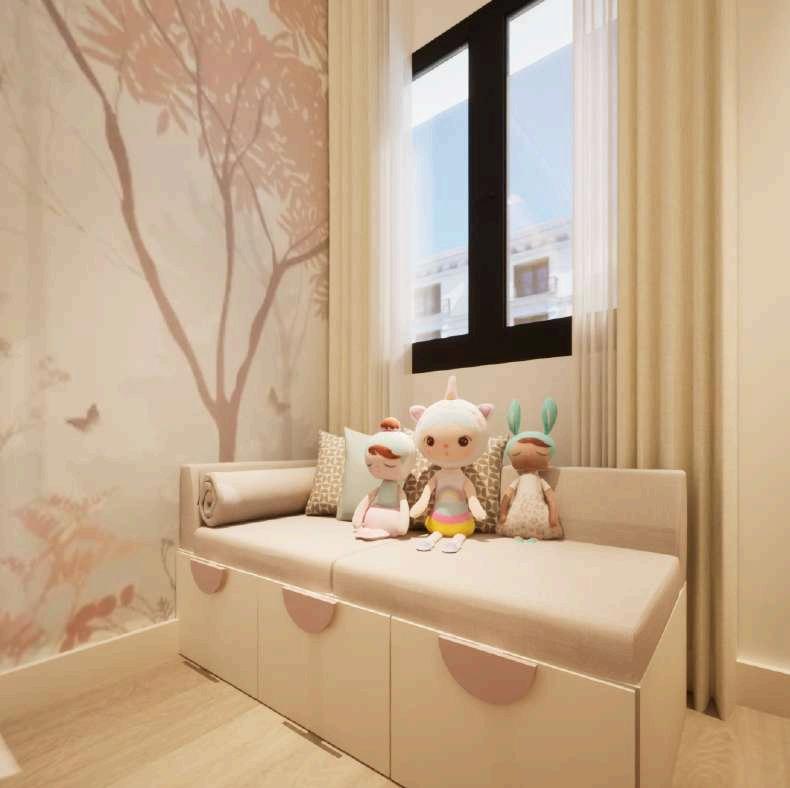 • Niña: con cama normal (no nido) de 1900x900 y mucho almacenamiento. Escritorio, espejo de cuerpo entero. Colores pastel y blanco. Le gusta el malva.