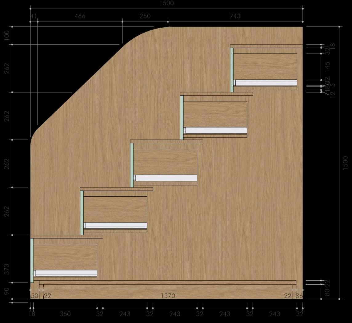Laterales horizontales MDF 19 mm con chapado de roble canteado frontal lacado en pintura plástica