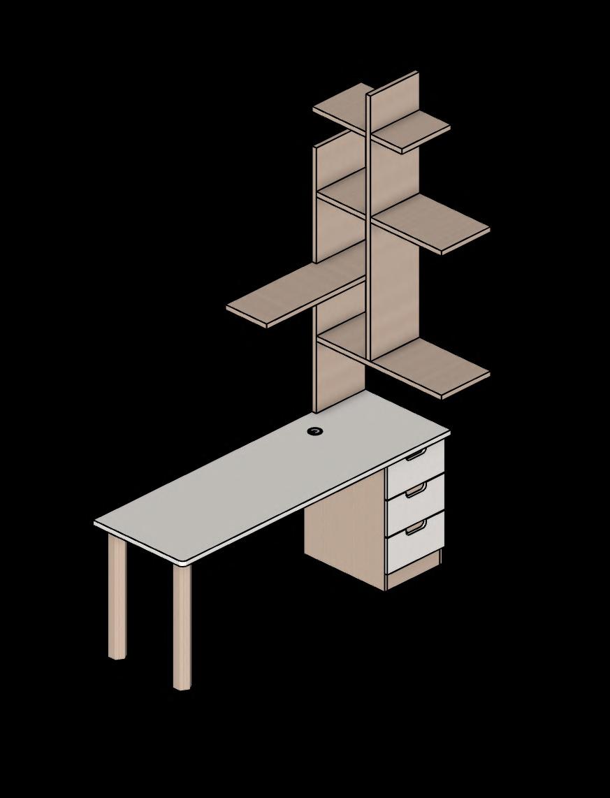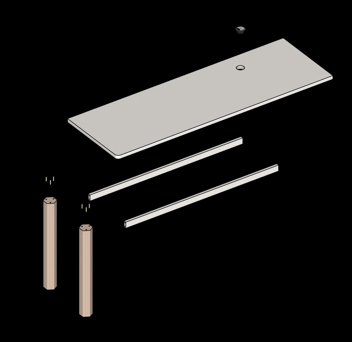 Sobre de mesa en contrachapado de 30mm lacado y canteado en NCS S 0502-Y50R. Con taladro de Ø60 mm para pasacables Häfele Nº Art. 428.96.702 (o similar).
