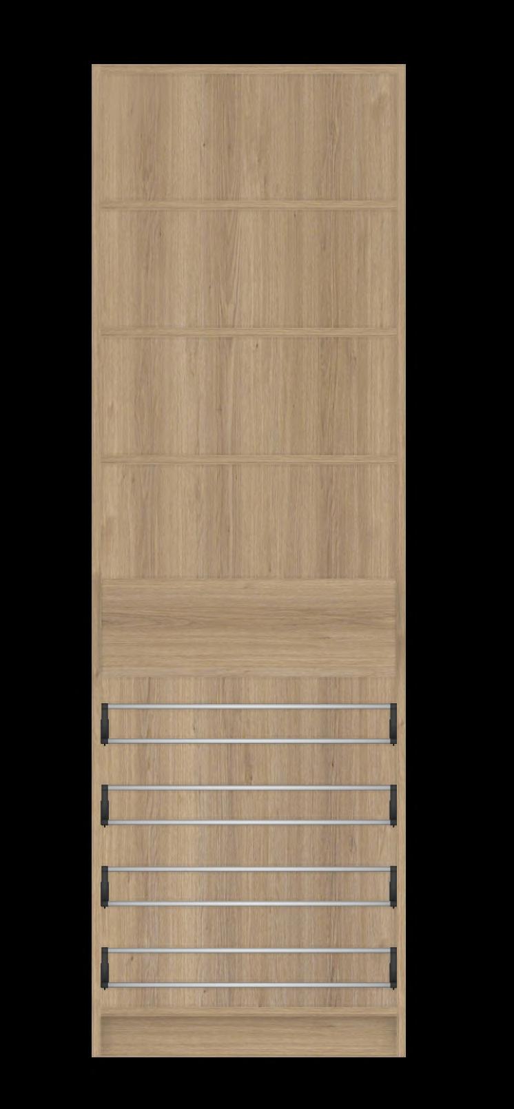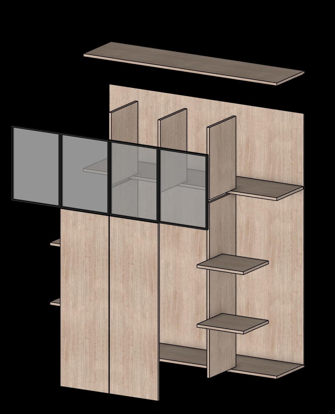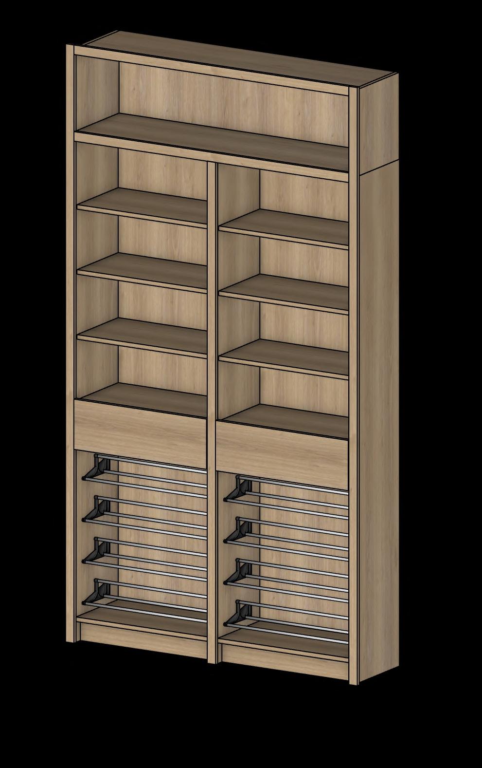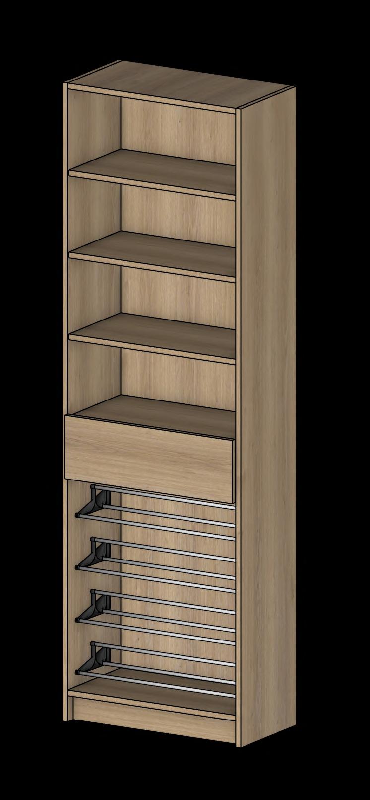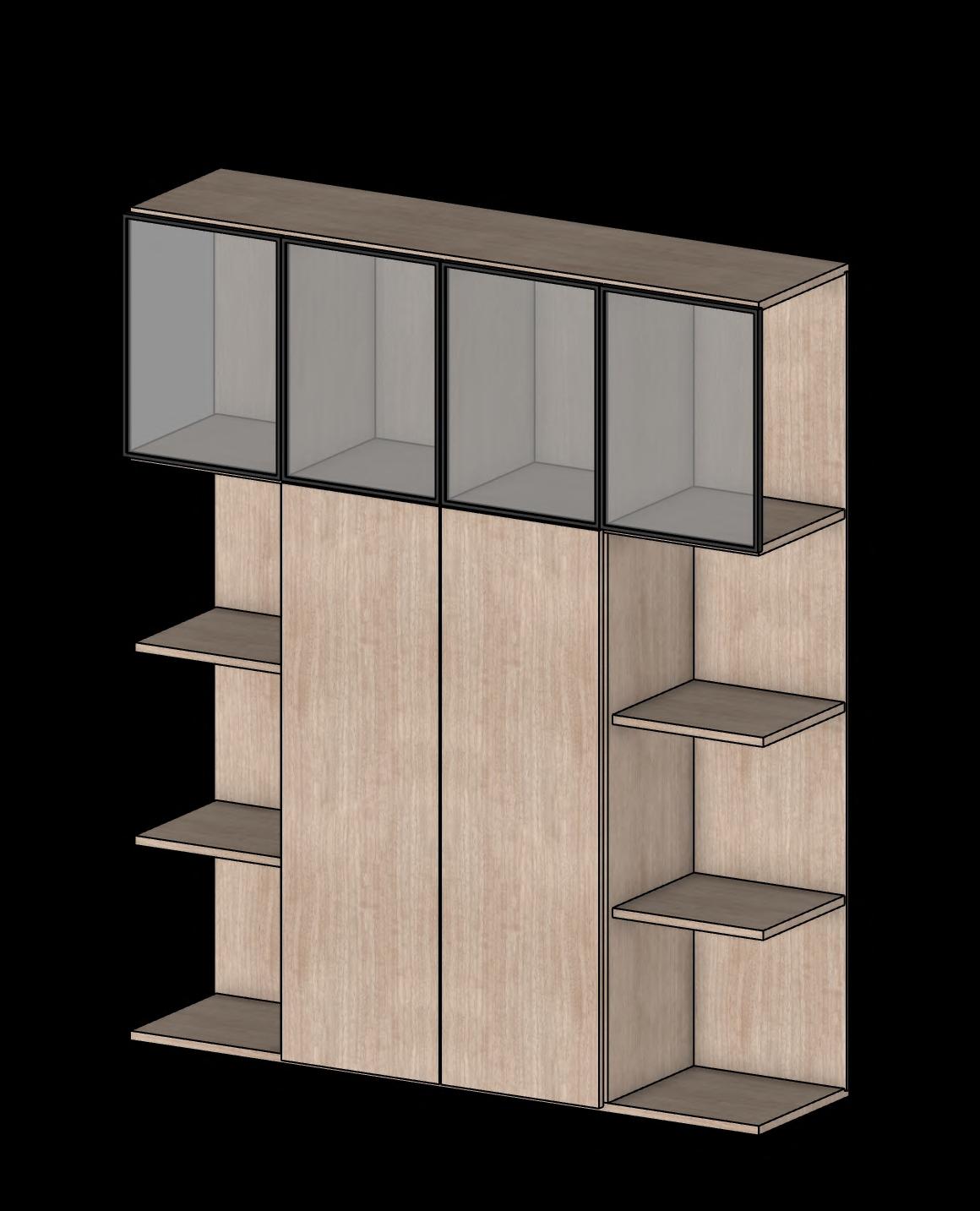 Módulo estantería en contrachapado de 30mm lacado y canteado en roble. Tableros unidos mediante excéntricas MI-FIX D15-11 ESPESOR 12 I6 (o similares).