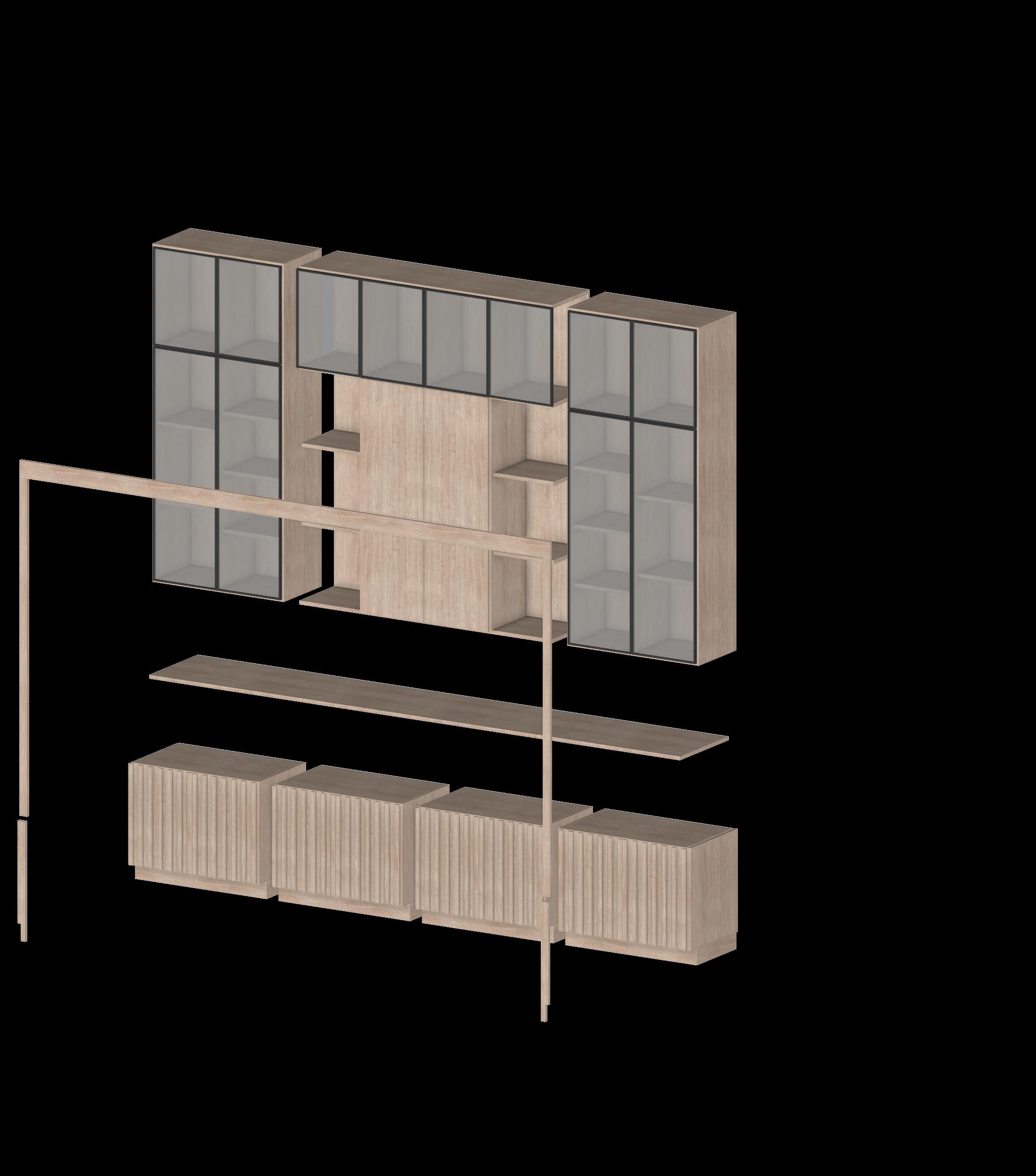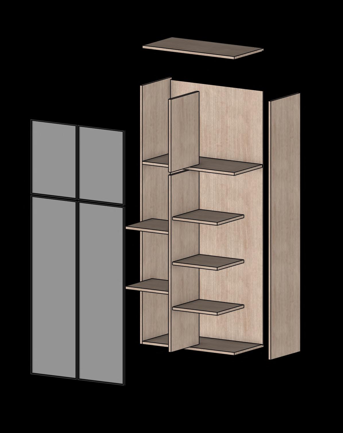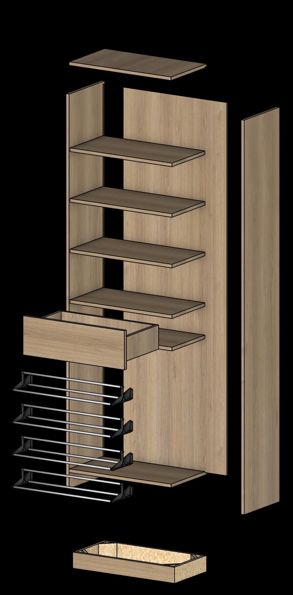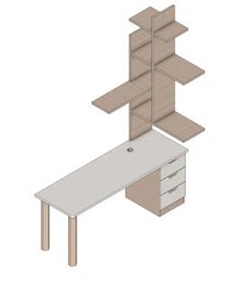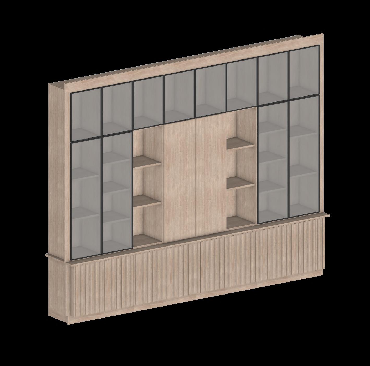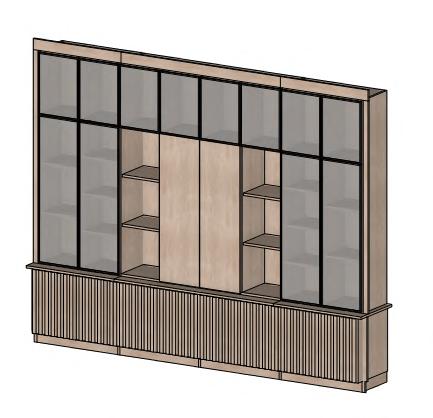 Módulo estantería en contrachapado de 30mm lacado y canteado en roble. Tableros unidos mediante excéntricas MI-FIX D15-11 ESPESOR 12 I6 (o similares).