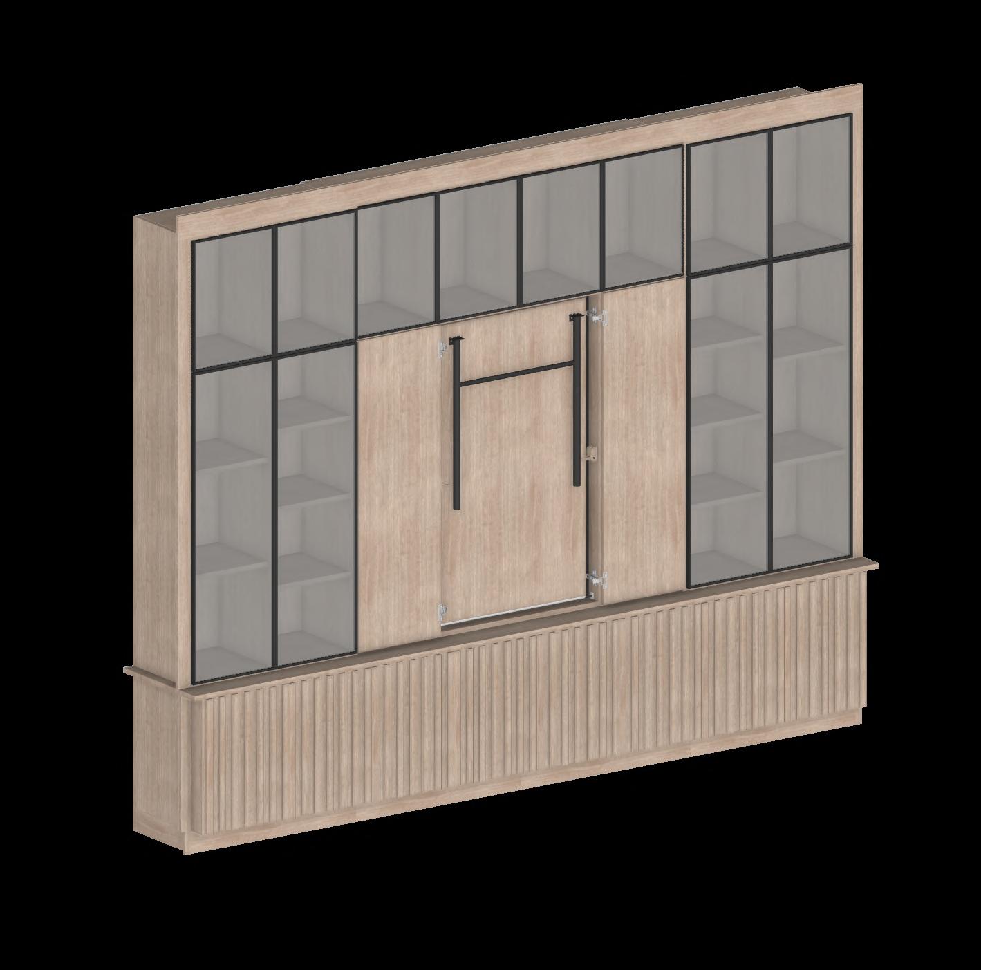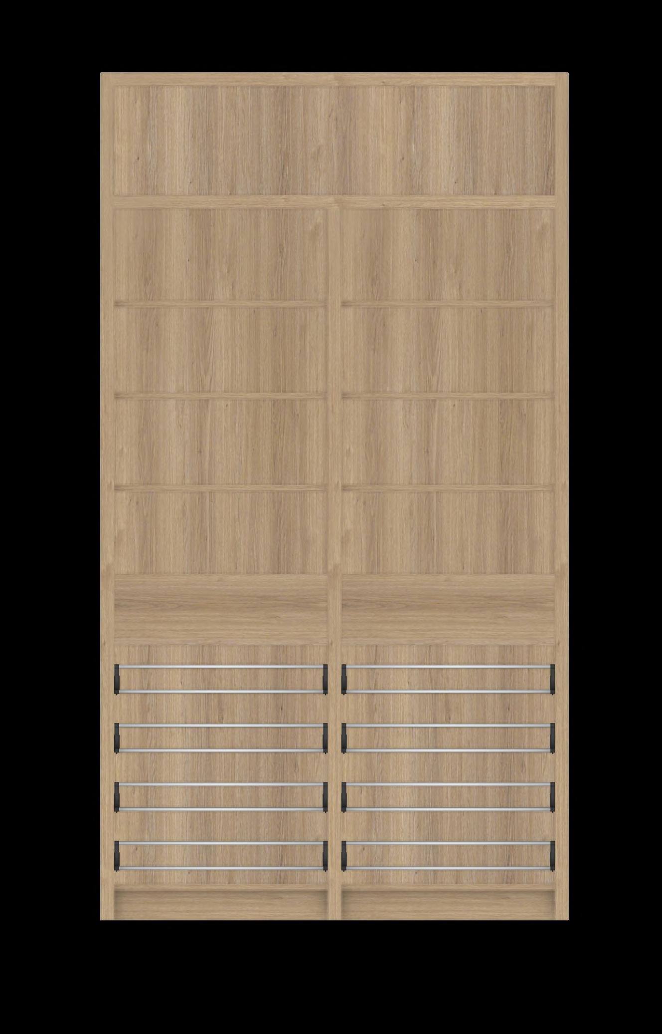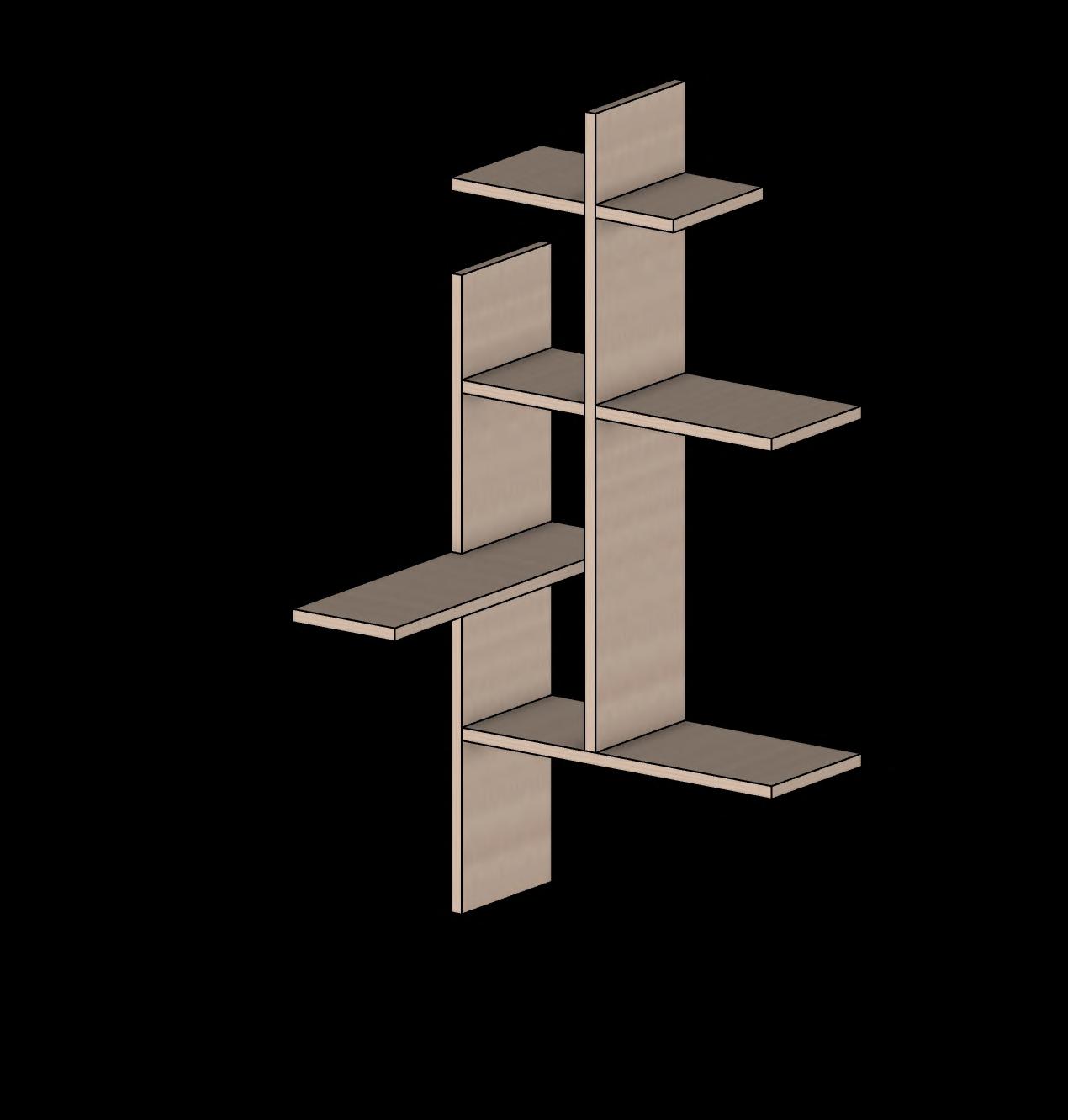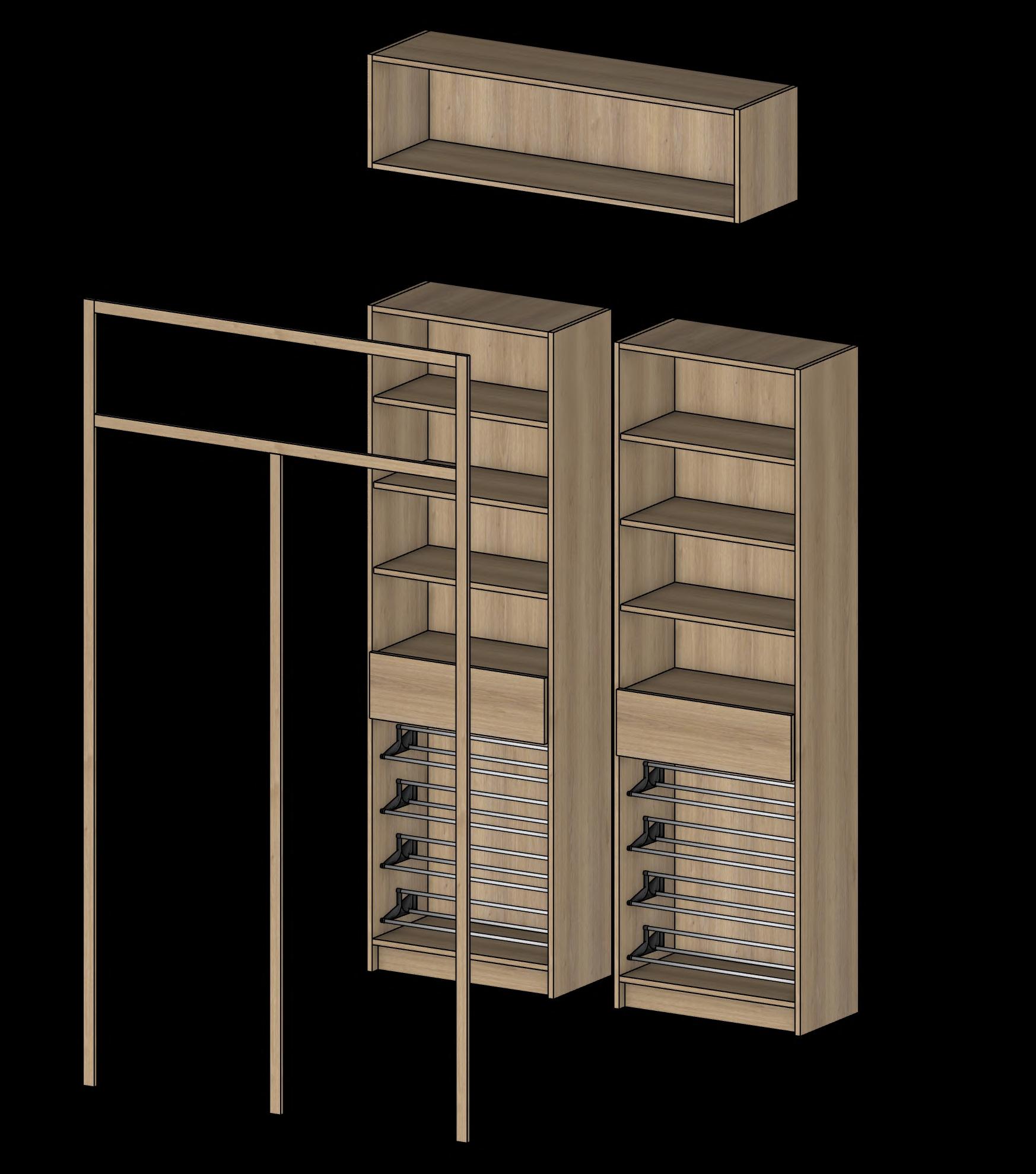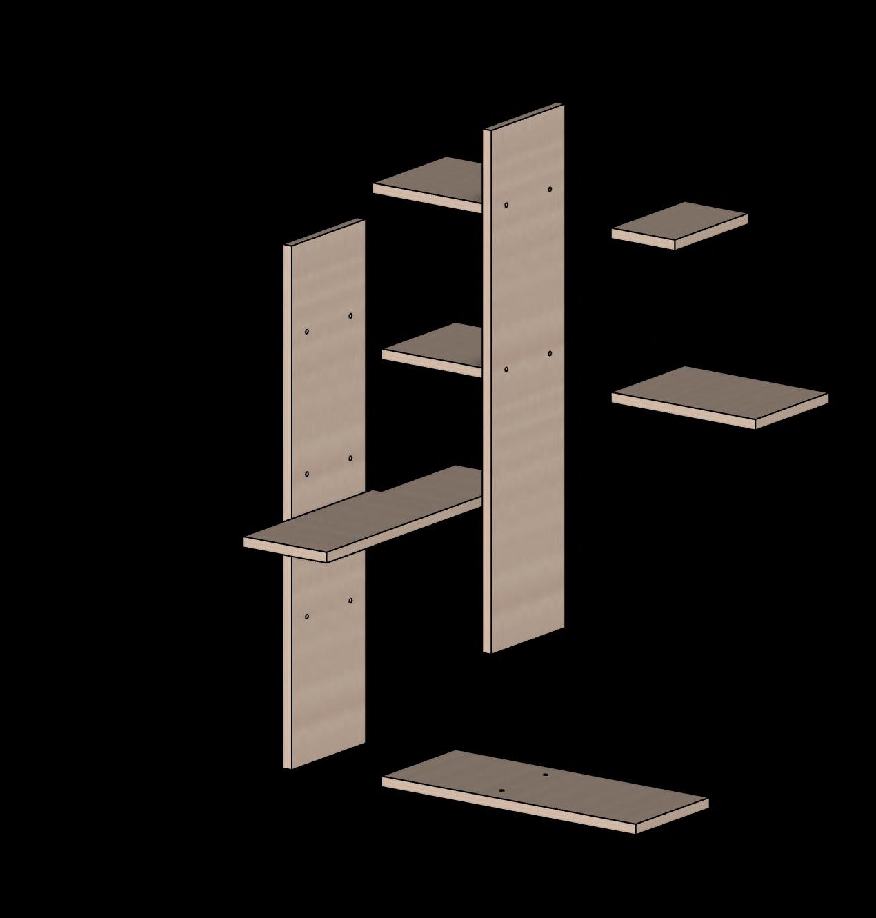Módulo estantería en contrachapado de 30mm lacado y canteado en roble. Tableros unidos mediante excéntricas MI-FIX D15-11 ESPESOR 12 I6 (o similares).