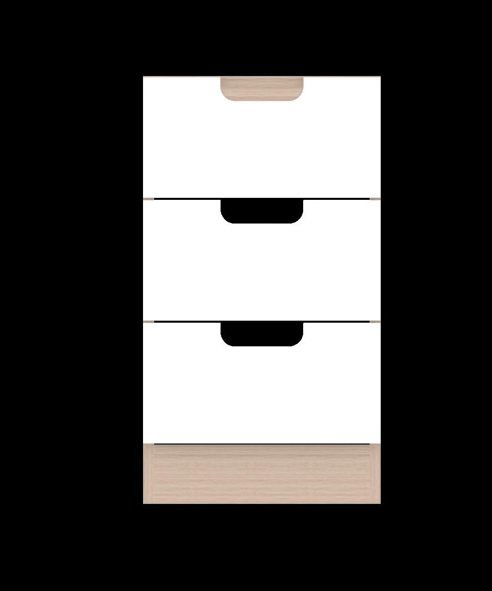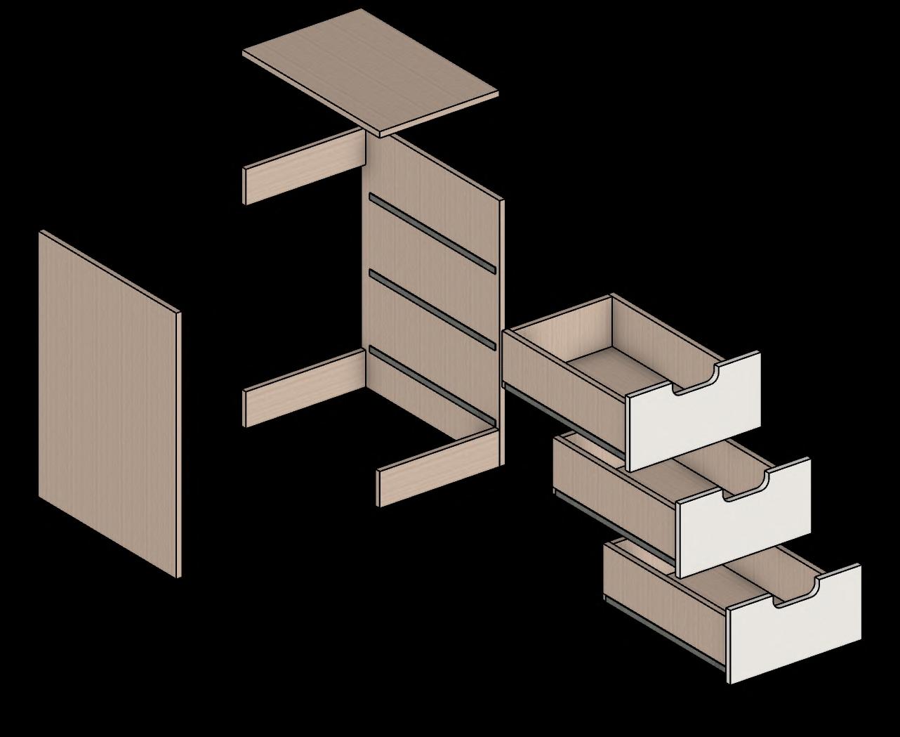 Cajones en MDF grosor 18mm, con frentes de cajón lacados en NCS S 0502-Y50R.
