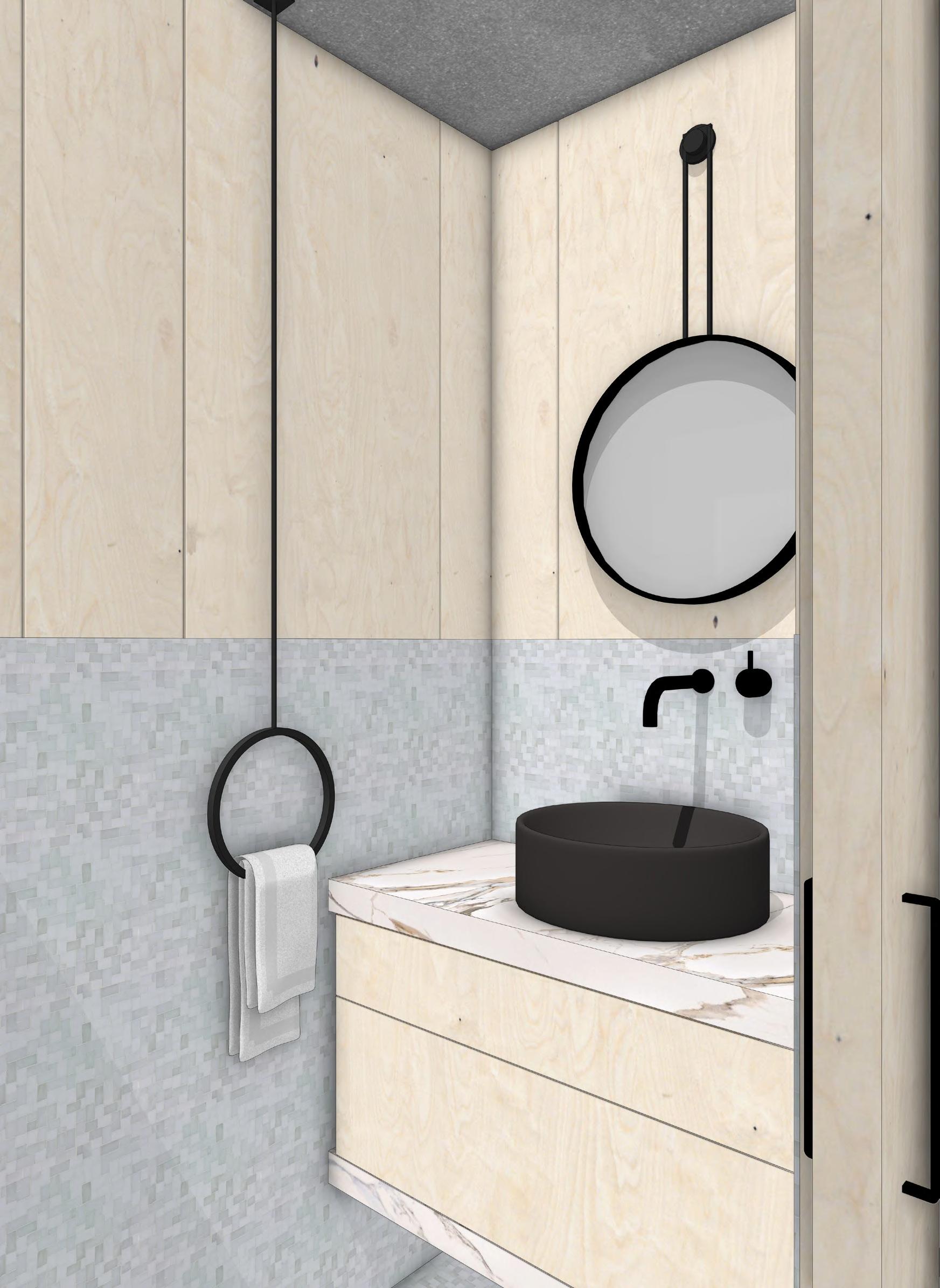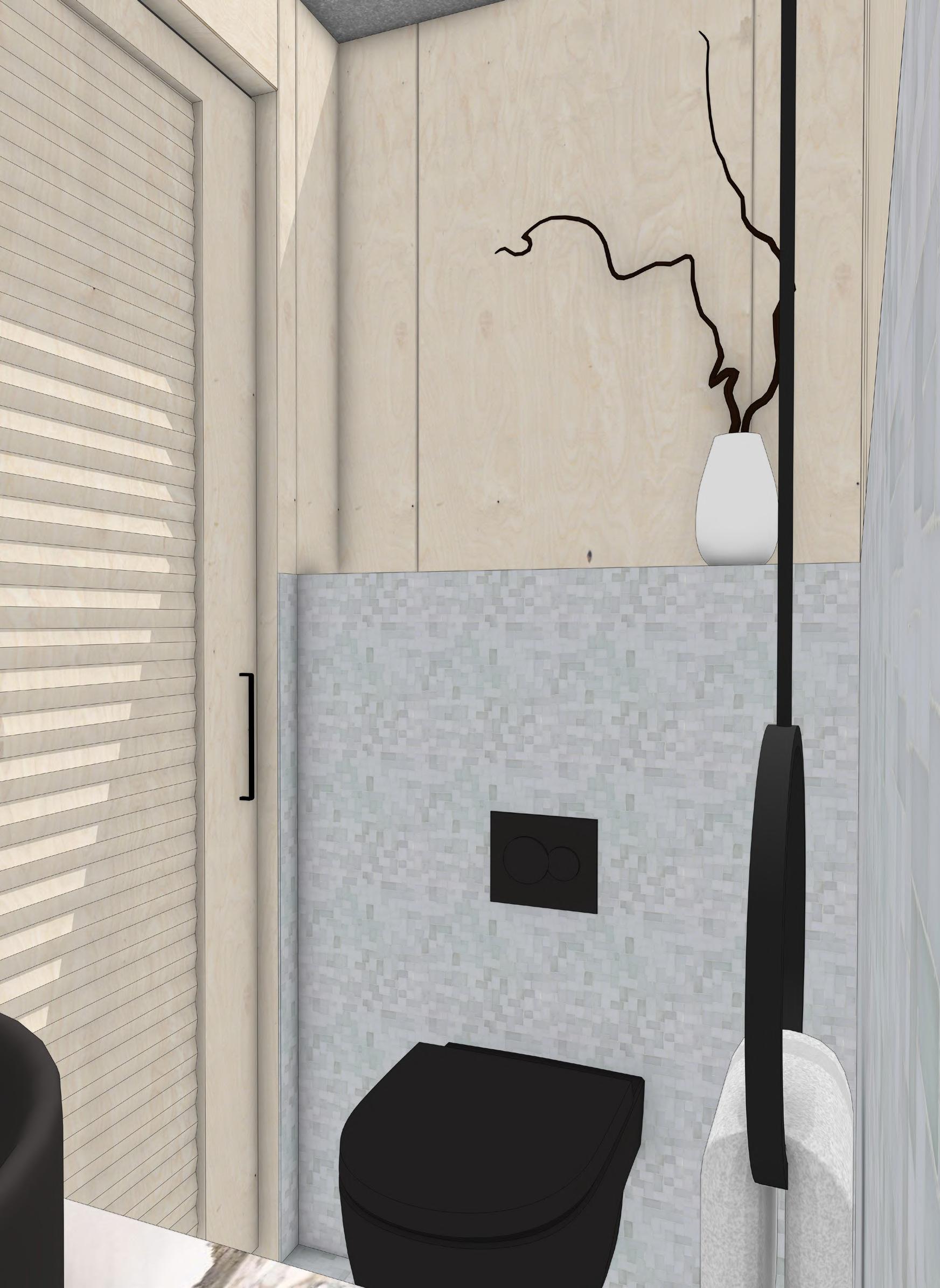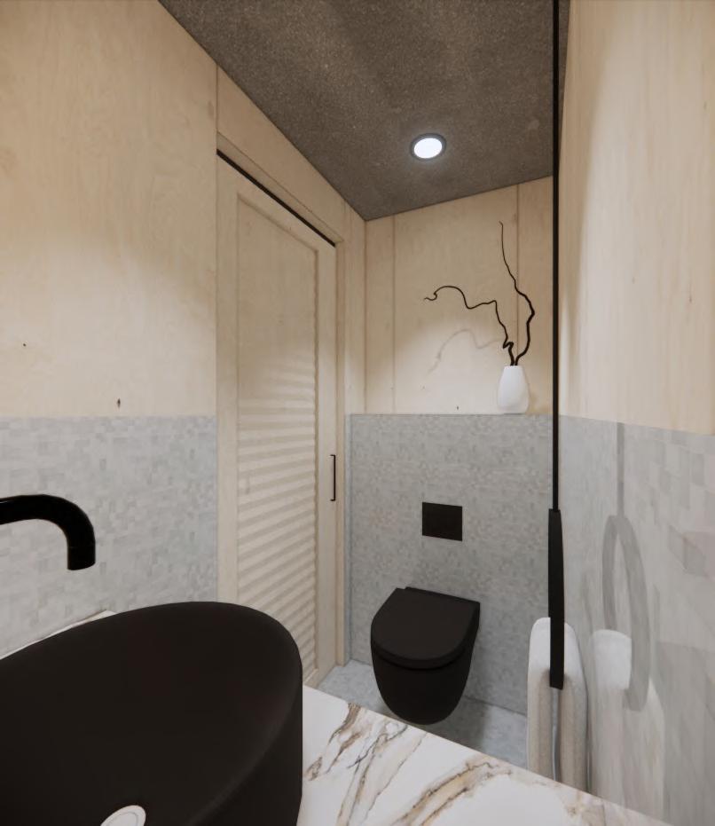 Aseo en zona de día, solo inodoro y lavabo. No más de 3 m2.
