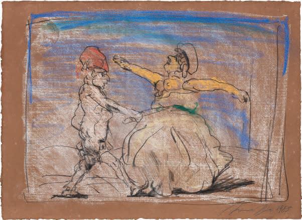 Mischtechnik auf festem Papier; gerahmt; 58 × 40 cm (Blattmaß) Bezeichnet, monogrammiert, datiert und signiert rechts unten: „Schwalbenkuss“ GB 84 A. Rainer
