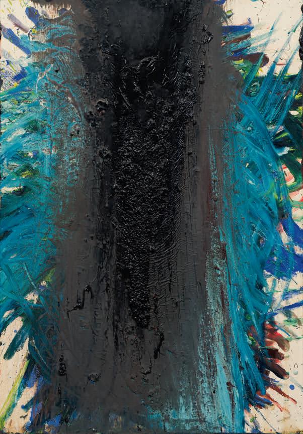 In den Malereien der 1980er-Jahre ist ein körperliches Eindringen in das Werk weiterhin das Thema. Der Impuls des Körpers trifft direkt die Leinwand. Hand- und Fußmalereien und der Einsatz von Hilfsmittel wie Stofffetzen oder Schwämme ersetzen den klassischen Pinselstrich. Die vorliegende Arbeit ist eine Farbexplosion an Fingerspuren, ein Chaos an Geste und Farbe. Erfrischend und ausgewogen in der Komposition. Strahlend in der Farbkombination. Verwischt und ausgezerrt und schließlich gebändigt durch schwarze erstarrte Farbmasse. Das Darunterliegende ist fixiert. Sichtbar. Der Kontrast der unterschiedlichen Malgesten vervollständigt das Gemälde. Tänzerische Geste und Erstarrung. Farbe und Schwarz als Gegenspieler.