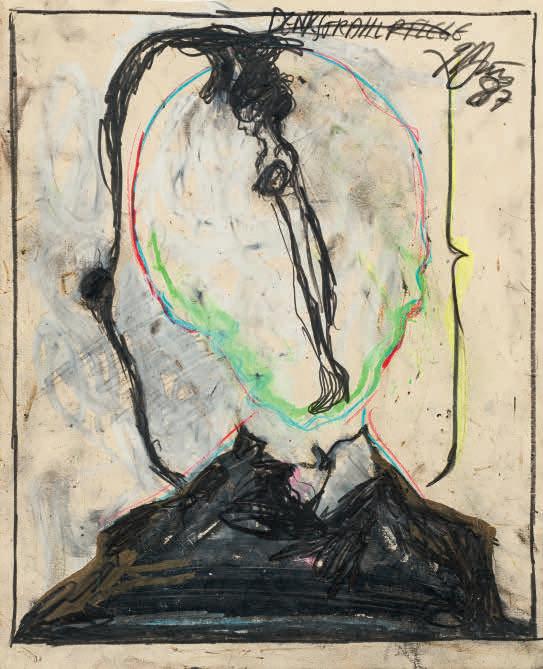 „Alles, was wir sehen, könnte auch anders sein“ (https://www.mmk.art/de/whats-on/franz-west/, aufgerufen am 19.4.2024), zitiert Franz West den von ihm hochgeschätzten Philosophen Ludwig Wittgenstein und spricht damit einen essenziellen Aspekt seiner eigenen künstlerischen Herangehensweise an. Das Prinzip der Kombination und Rekombination entspricht seiner Überzeugung, dass die Bedeutung einer Äußerung oder eines bildsprachlichen Elements nie fix und eindeutig definiert sein kann, sondern sich im jeweiligen Kontext ändert. Diese Grundprinzipien, die später sein skulpturales Werk bestimmen werden, klingen schon im frühen bildnerischen Werk an.