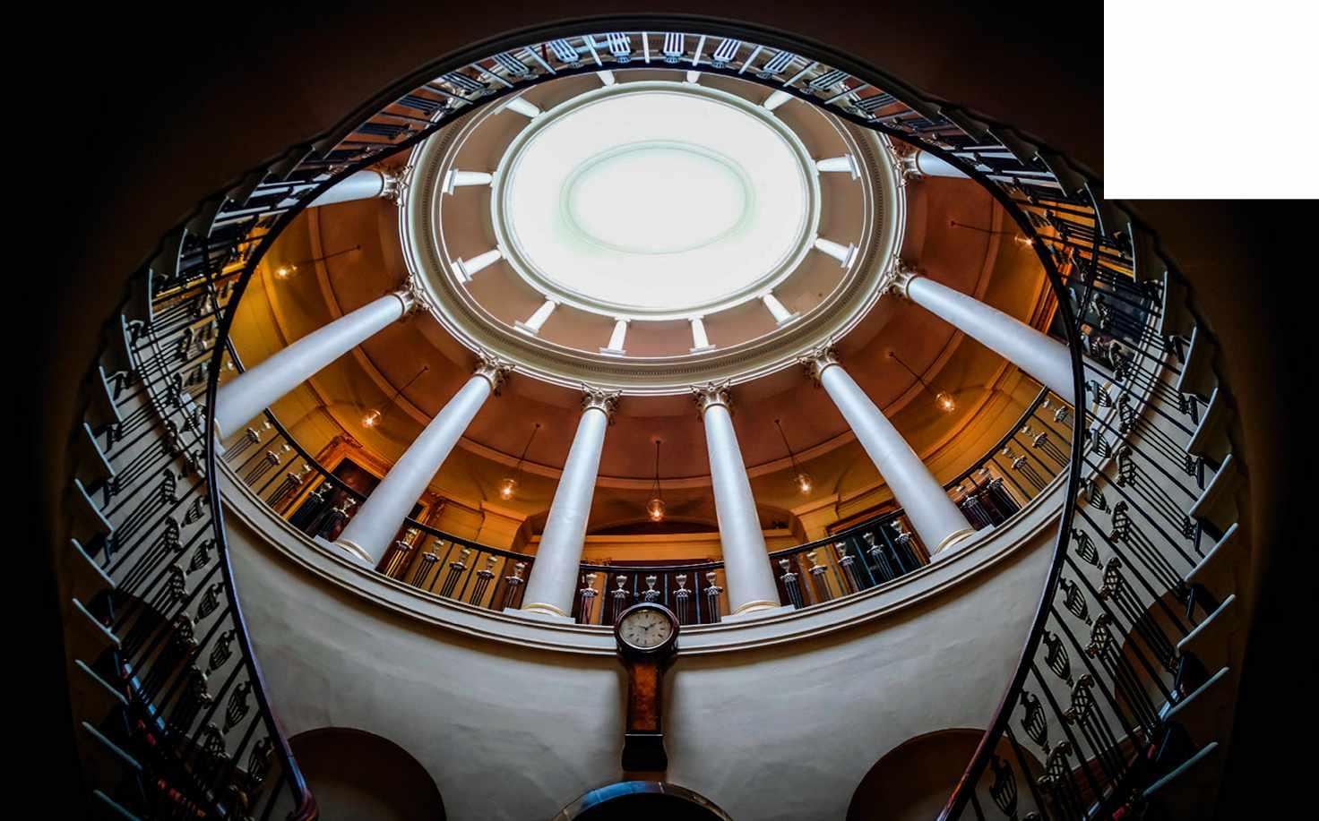 One cannot write about Culzean without mentioning the oval staircase at its heart, perfectly encapsulating, as it does, the Romantic drama of the castle. Light pours in from the glass cupola above the sweeping imperial stairway, while soaring Corinthian and Ionic colonnades trick the eye into thinking that the space is larger than it is.