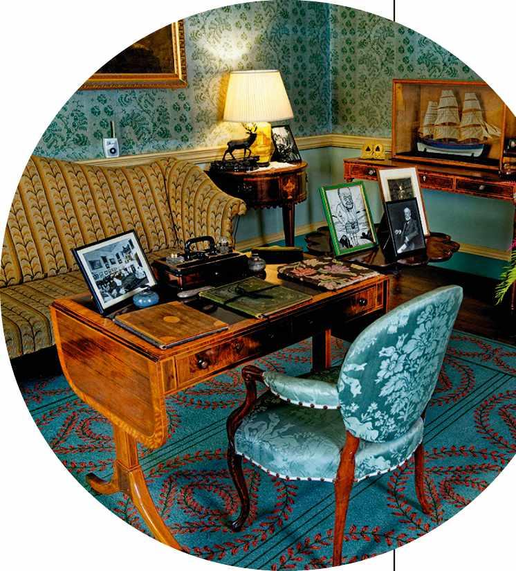 The staircase leads to the round drawing room, an elegant space with little furnishing except for the few seats and tables dotted around the edge. The crescent of large windows is cunningly placed to maximise the natural light flooding into the room, while providing a dramatic view of the Firth of Clyde. A place for entertainment, it was originally called the saloon. In the words of Culzean Castle’s collections care officer and head guide, Gordon Nelson, standing at the windows watching the sun set is so stunning it is almost “indescribable”.
