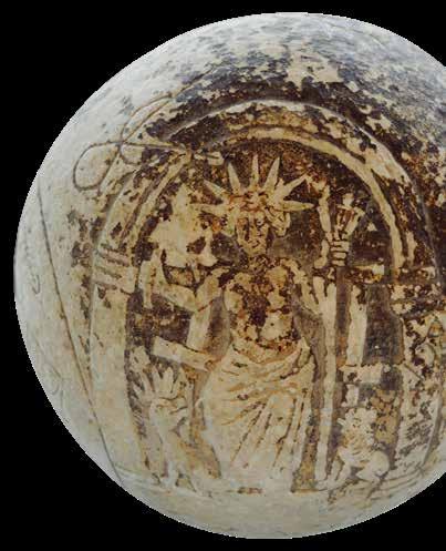 CLOCKWISE FROM TOP: Demons depicted on a Babylonian cylinder seal, c5000 BC; a Greek ‘magic sphere’, used by warriors before taking part in duels, second or third century AD; a diorite head of Hammurabi, who passed laws against witches, c1750 BC