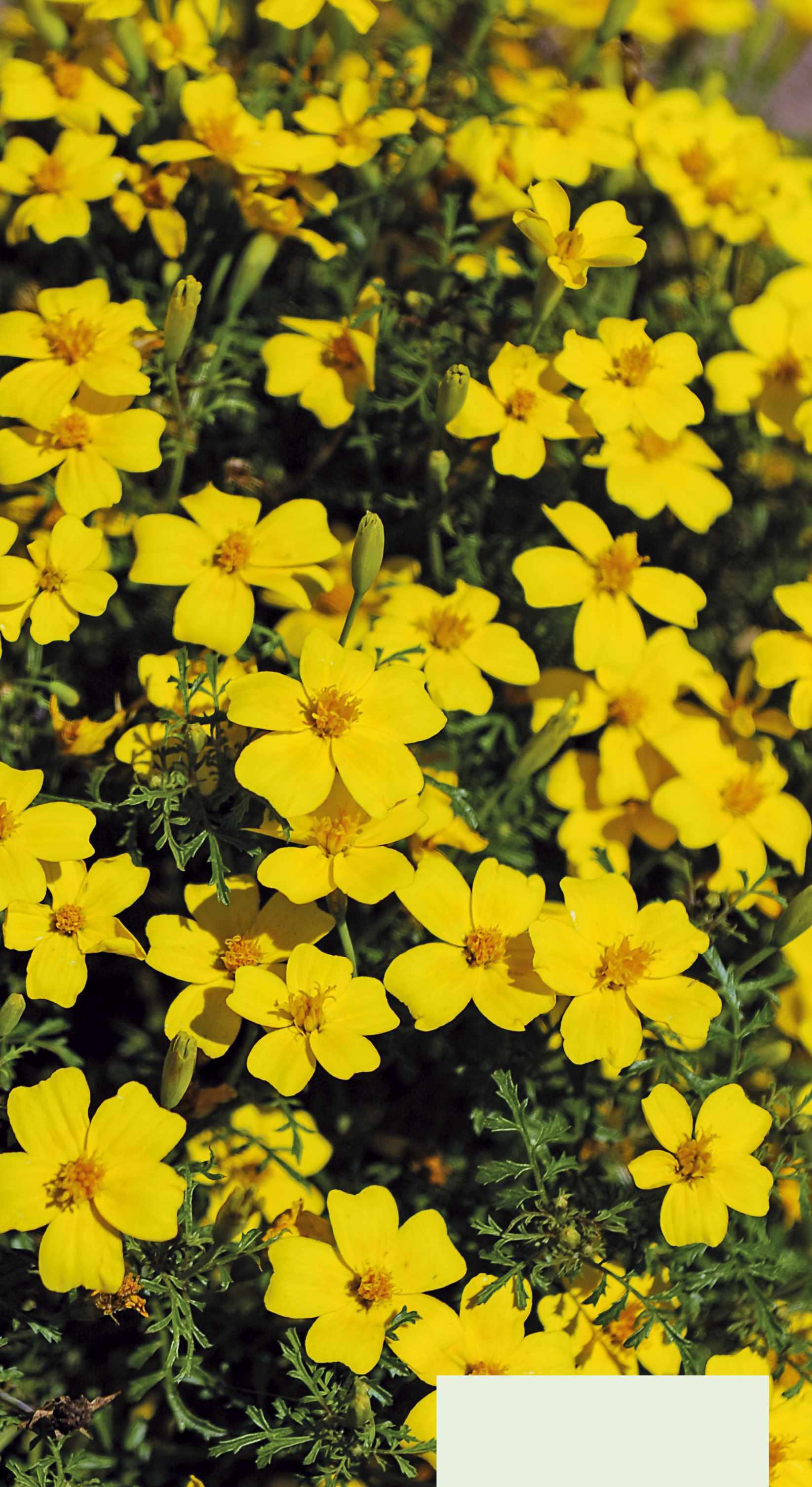 ■ Care These are frost-tender, half-hardy annuals to sow in spring in a propagator and grow on in the greenhouse or propagator for planting after the last frost. Regular deadheading is important to keep the plants looking good and to keep the flowers coming, although this is far easier with African marigolds than with ‘tagetes’ types.