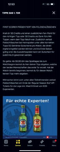 Wie Sponsoring-Aktivierungsmassnahmen gekonnt umgesetzt werden, zeigt das Beispiel von Feldschlösschen als Presenting Partner des Fan-Games auf der SCB-App: Zuschauerinnen und Zuschauer können über die App interaktiv eine Prognose zum aktuellen Spielgeschehen abgeben – und werden dafür mit sogenannten «Credit Points» belohnt. Diese Points können dann für den Bezug von Getränkegutscheinen, exklusiven SCBFanartikeln sowie weiteren Produkten eingesetzt werden. Dadurch wird auf spielerische Art ein Bezug zur Marke sowie deren Angebot erreicht.