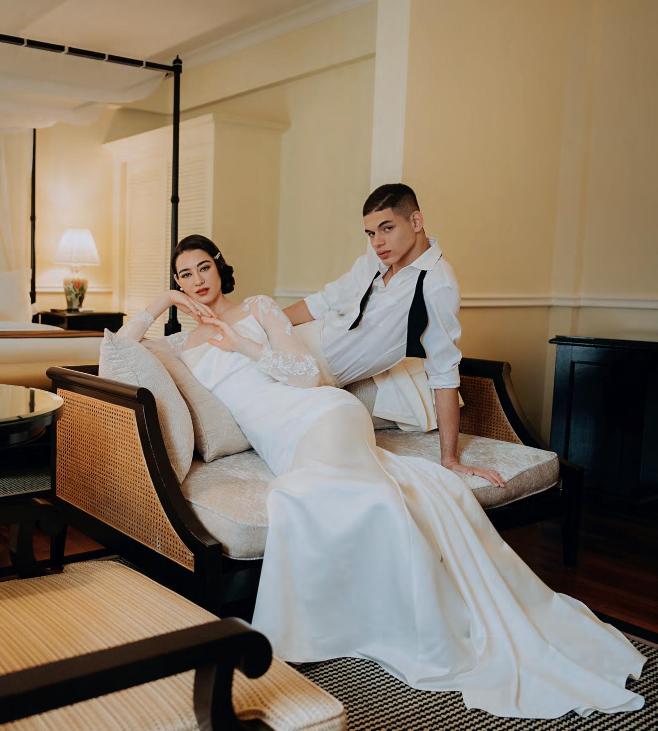 This and facing page: On her: 23 WEDDING LUXE sangjit; shoes and accessories, stylist’s own. On him: THE MAN SUITS suit; shoes, stylist’s own.