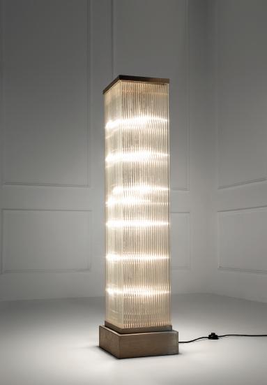 Vetro soffiato trasparente costolato e a torciglione, ottone.