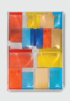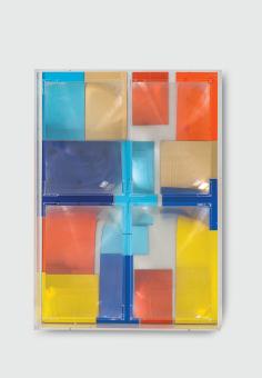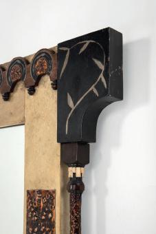 Legno tinto, inserti di vetro colorato, vetro specchiato molato, ottone.