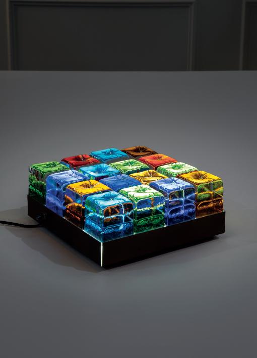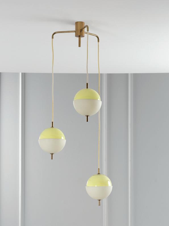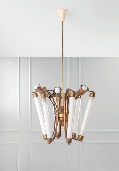 Metallo verniciato, ottone, sei elementi illuminanti al neon.