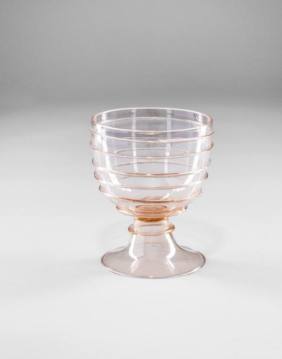 Vetro soffiato trasparente rosato con piede a campana, decorato da fili vitrei applicati.