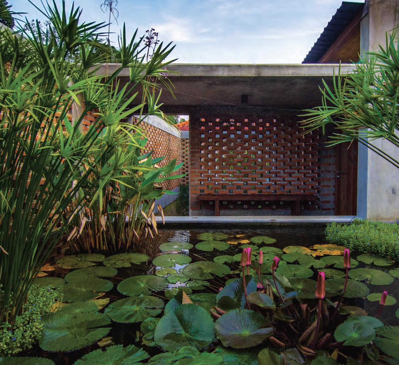 The building is a split-level construction responding to the sloping site, thus avoiding cutting and fi lling. The ground floor is given over to the artists’ studio and gallery space looking out on to the gardens and paddy fields beyond. It also includes dining, kitchen and garage spaces and is completely open without doors or windows. The upper floor is the secure, private domain with three bedrooms and a two-sqaure-metre rooftop lily pond “fi lled with freshwater fi sh that acts as a meditative oasis for the couple”.