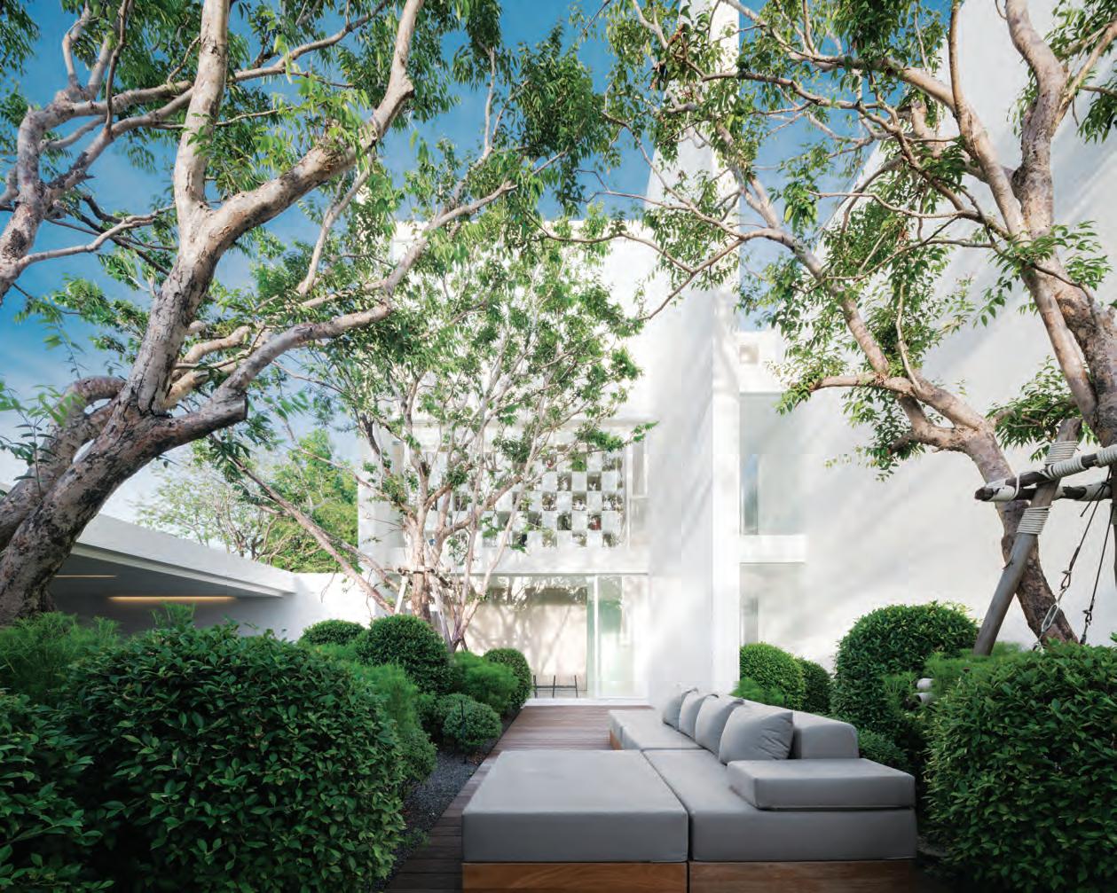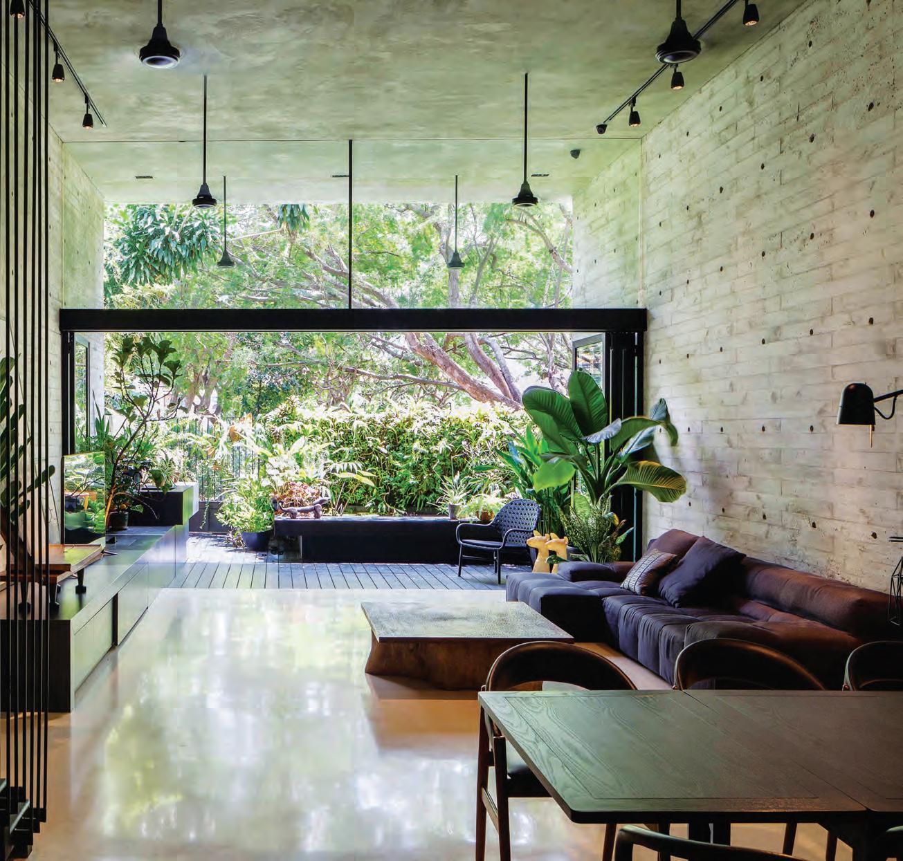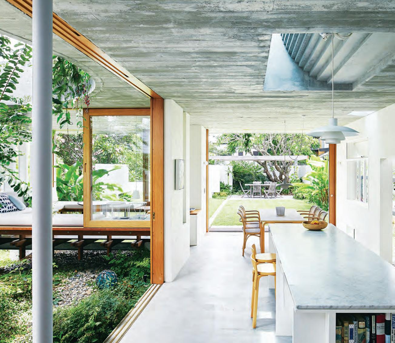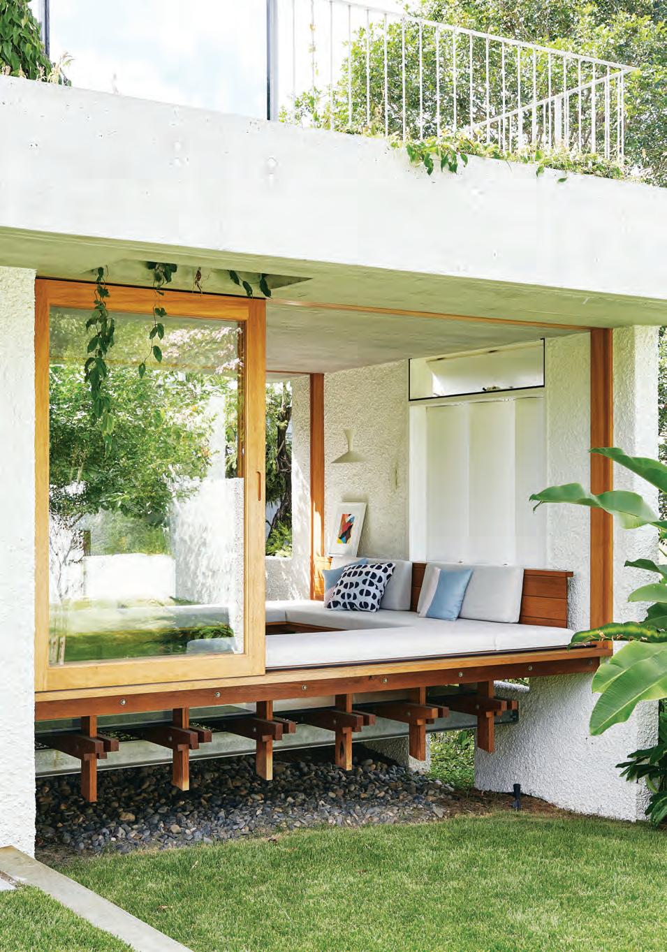 opener | From the street the connection between house and garden is signaled by an elegant steel Fr ame. above | th e lush garden has a strong impact on the visual appeal and atmosphere o F the site. opposite above | th e living space is oriented to savour the tropical landscape. opposite below | the master bedroom seems to Float amongst the trees.