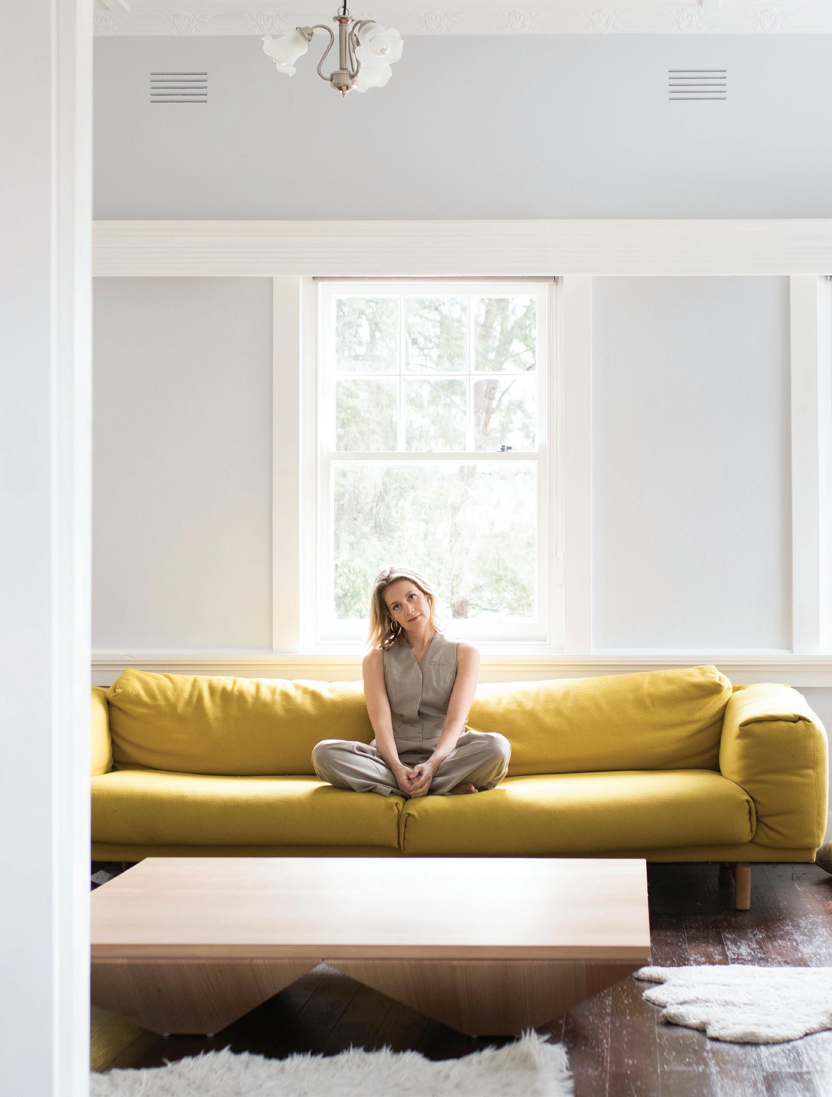 Sofa from Freedom. CM05 Habibi Tray Table by E15 from Living Edge. Zinnia Rug from Armadillo & Co. Custom table by client. Bench 153 by Artek from Anibou.