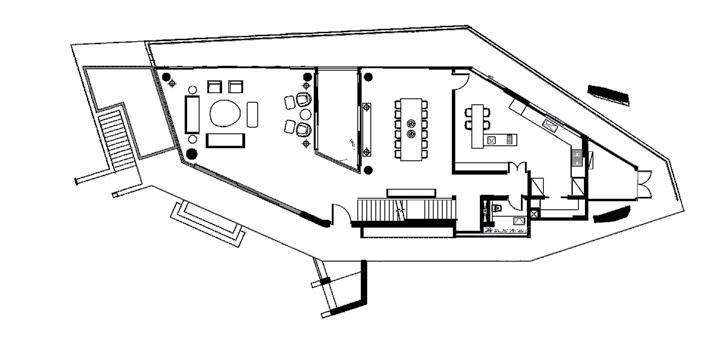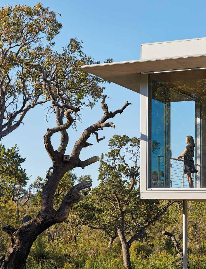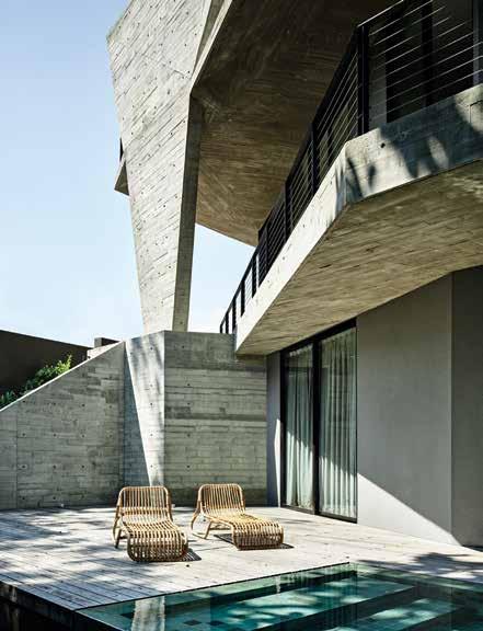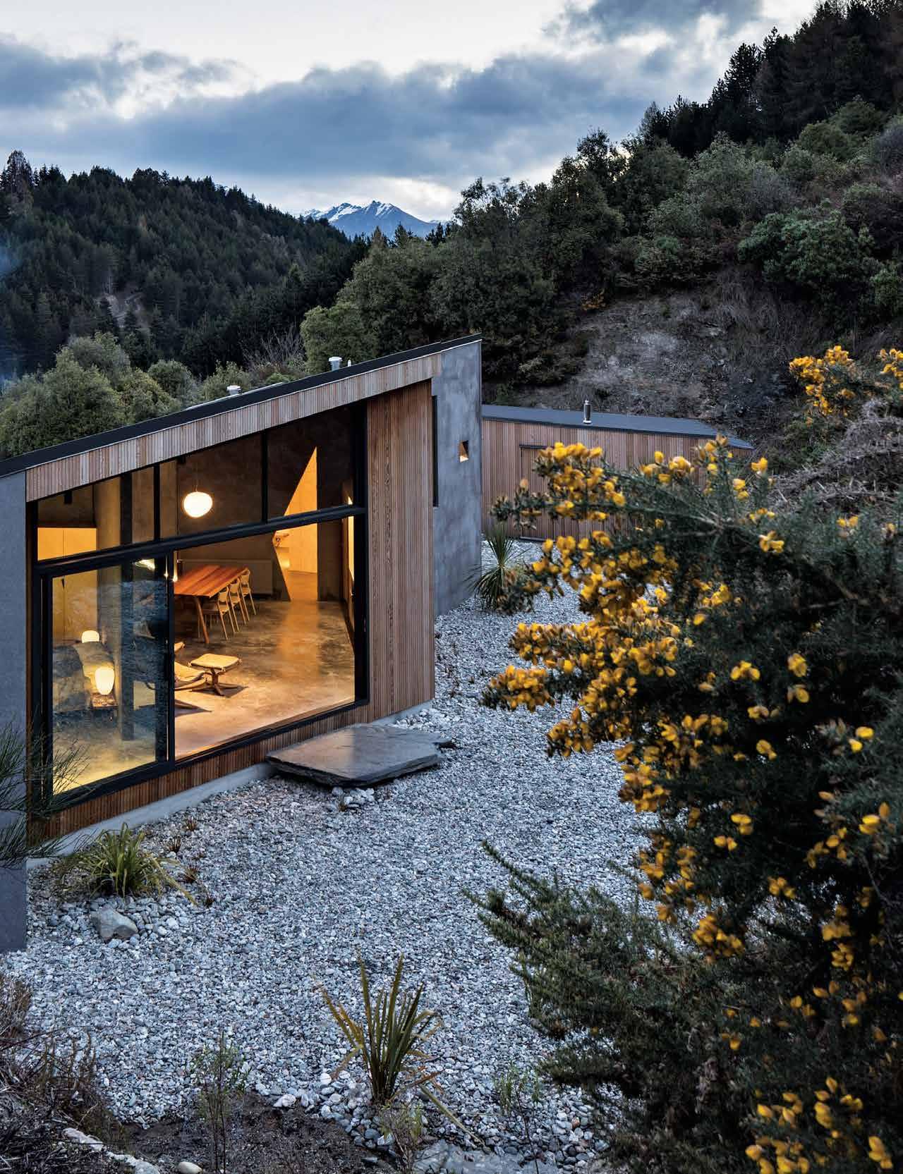 the notional rock fragments – the garage and two sleeping spaces. Wrapped in thermallyseparated pre-cast concrete, they are coloured the same dark grey as the underlying schist. Spaces in between – kitchen, dining and living –are clad more lightly in glass and cedar.