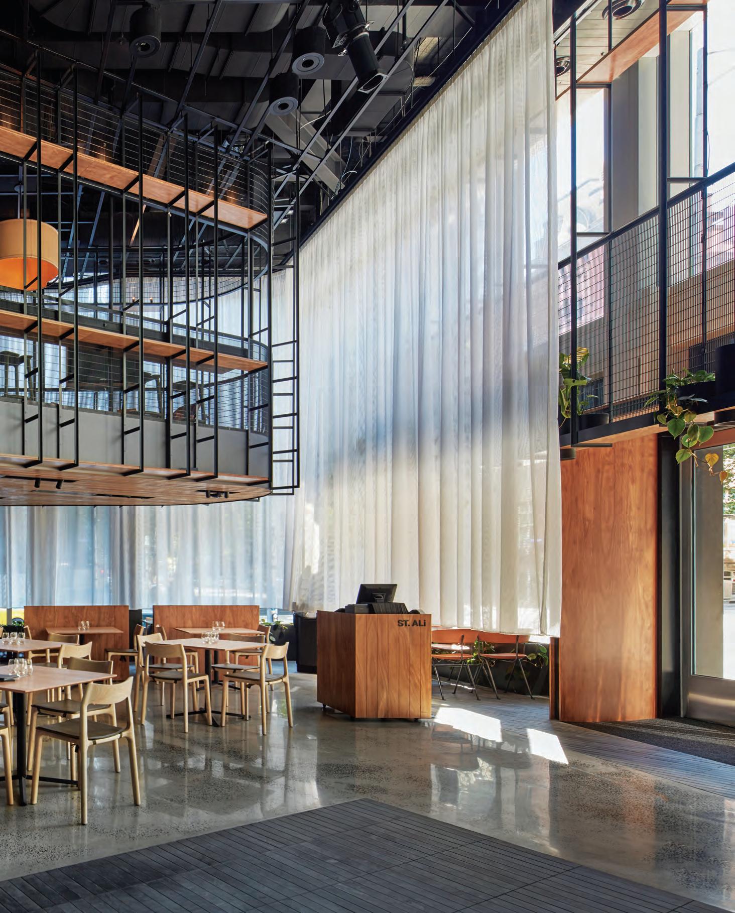 small cafés. The 160 square-metre space features a central bar that demarcates two dining experiences; one defined by the theatre of an open kitchen and pizza oven, and the other offering an intimate zone for quiet conversation.