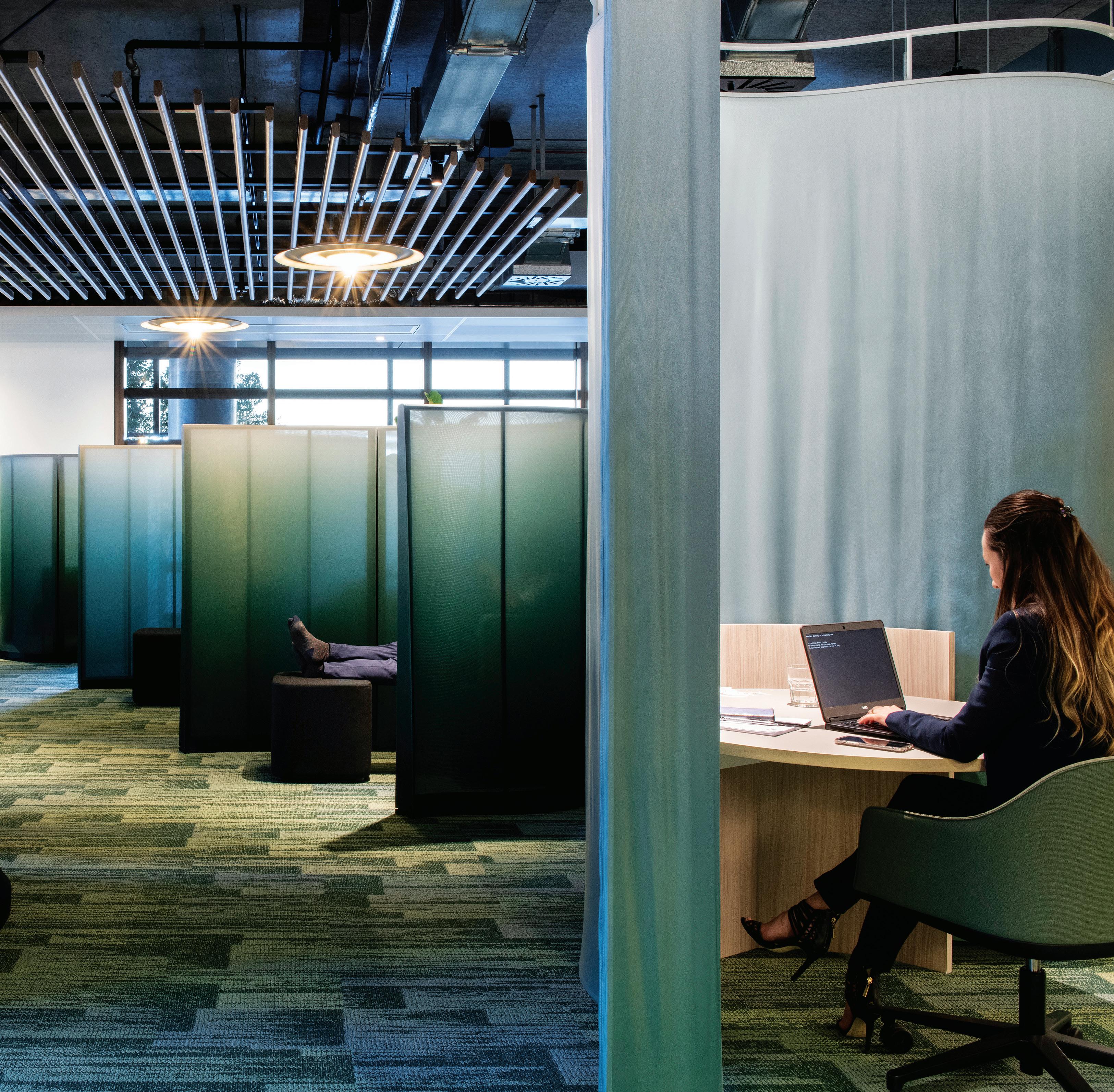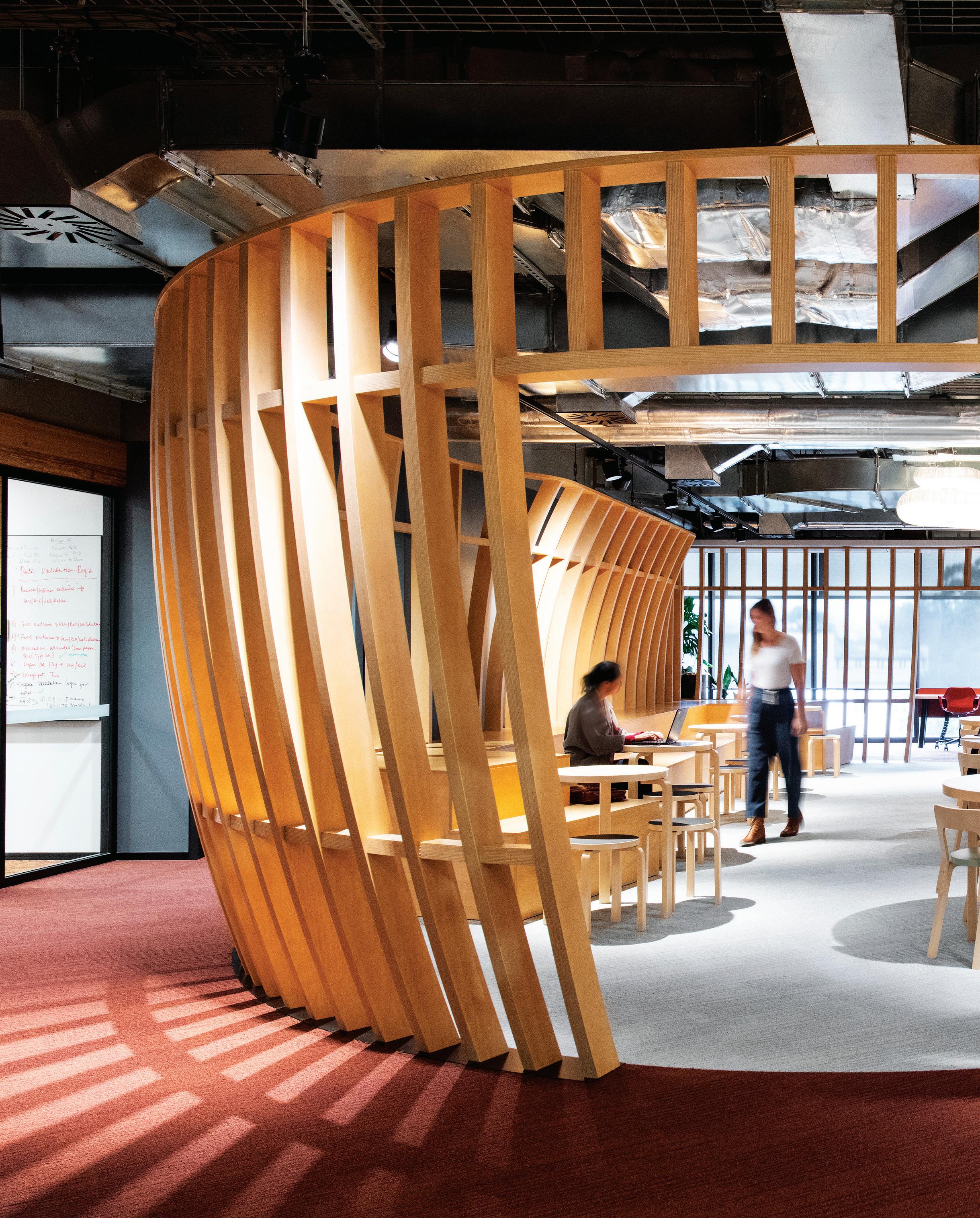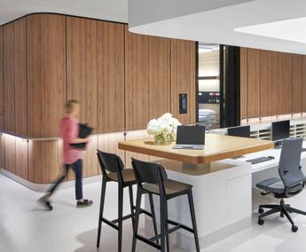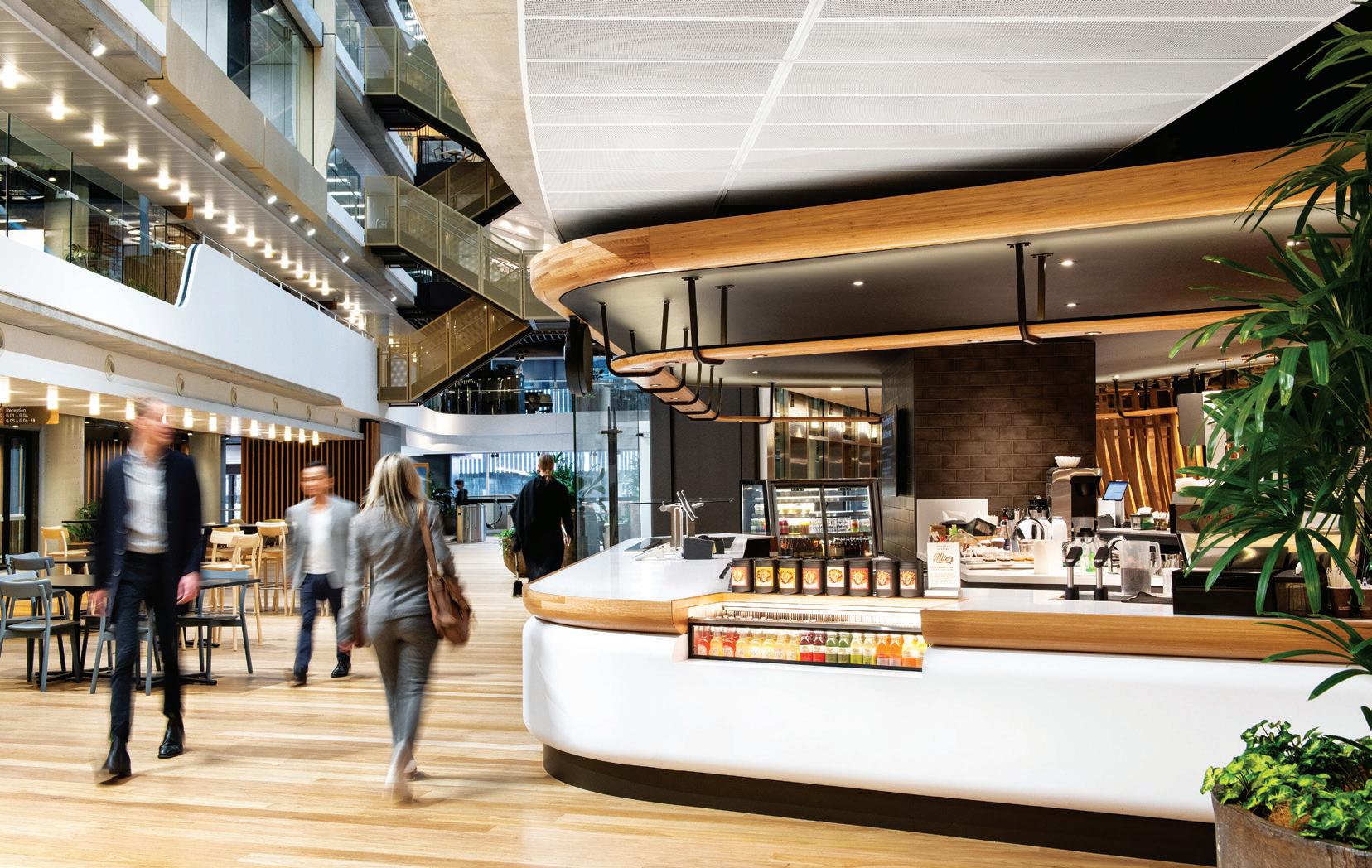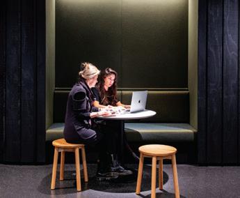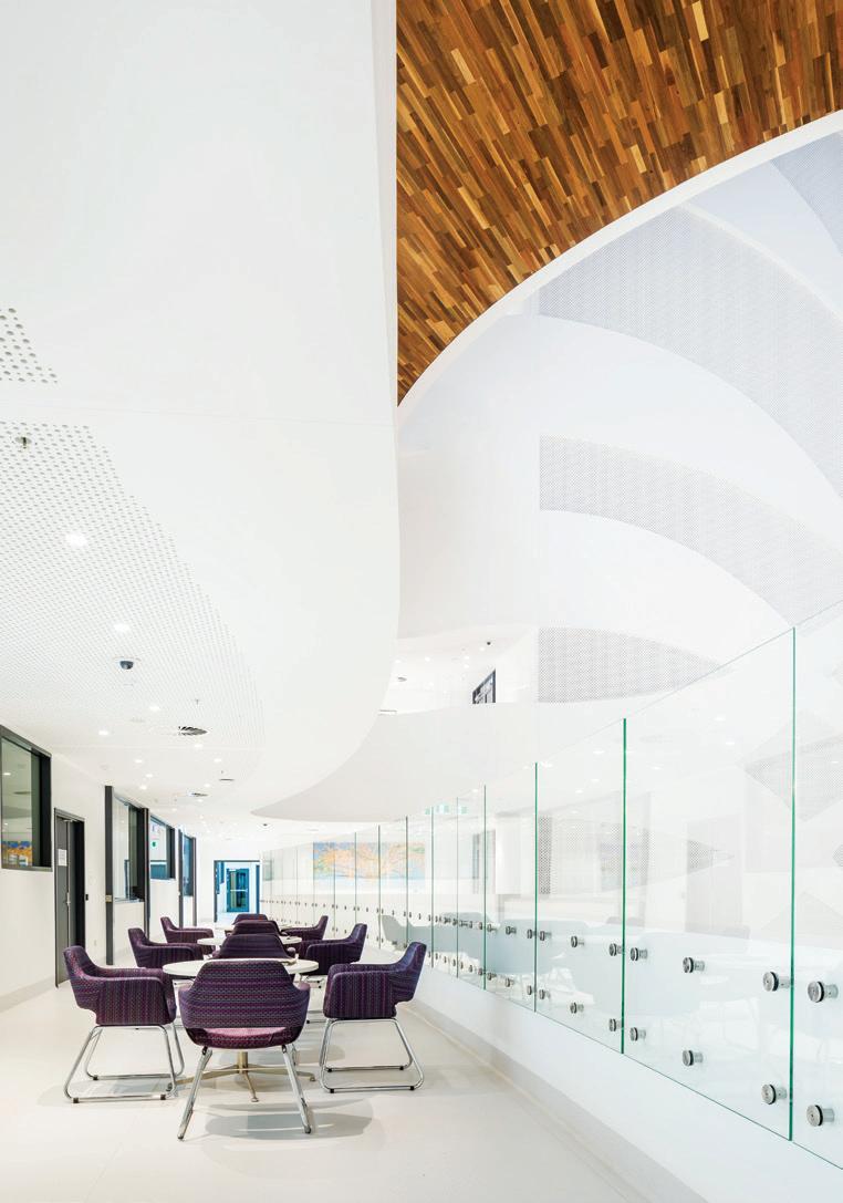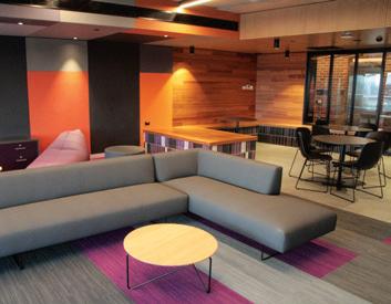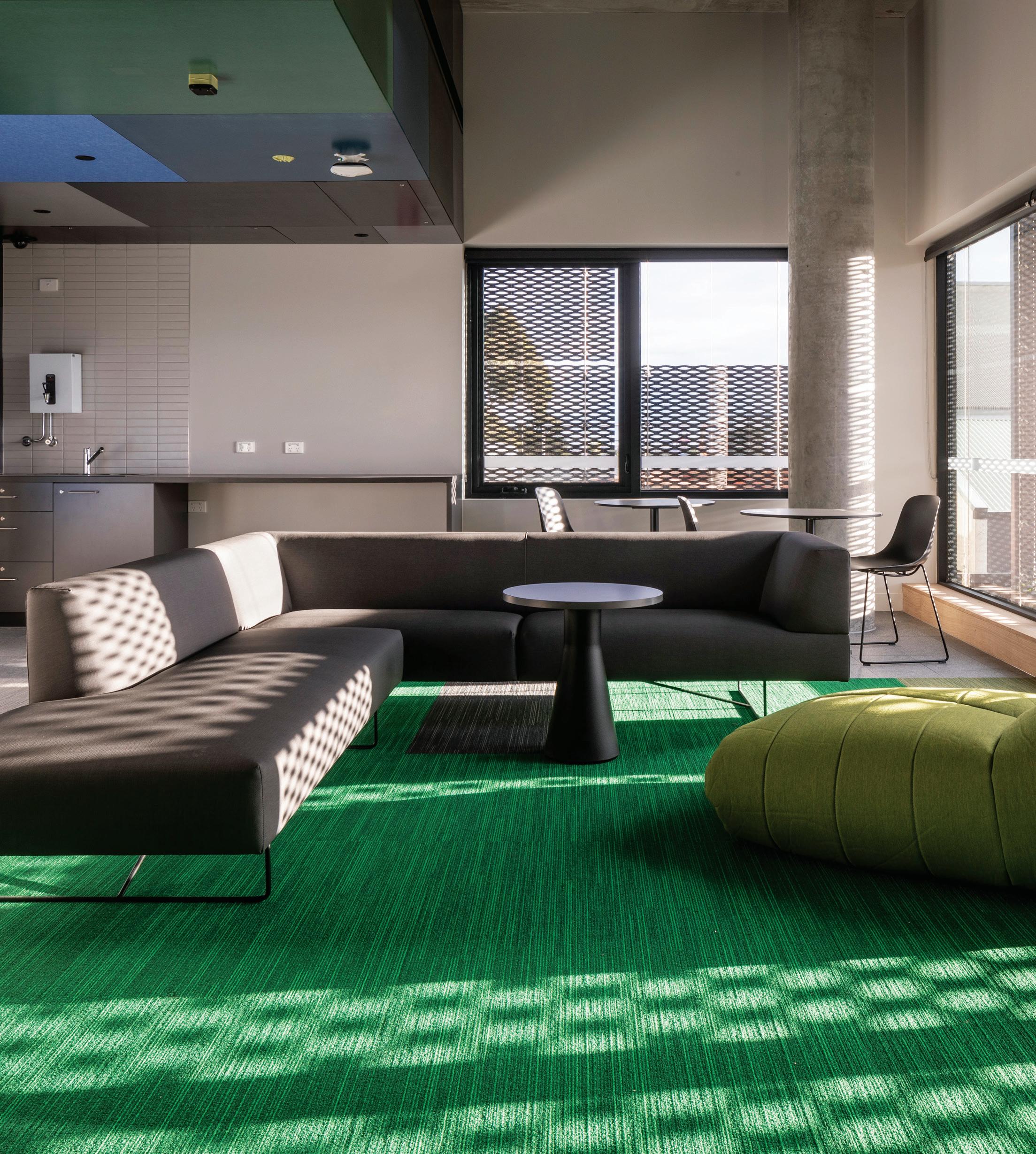 Ornamenta and Gamma Due wall tiles, Urban Edge. ‘BT Bamboo’ flooring, Ecoflooring. Laminates throughout, Laminex. Flooring carpet riles, Interface. Tiles, Signorino Tiles. Acoustic tiles, Atkar. Feature wall and ceiling, Sculptform. Paint throughout, Dulux. Textiles, Instyle.