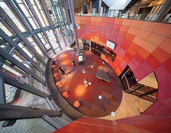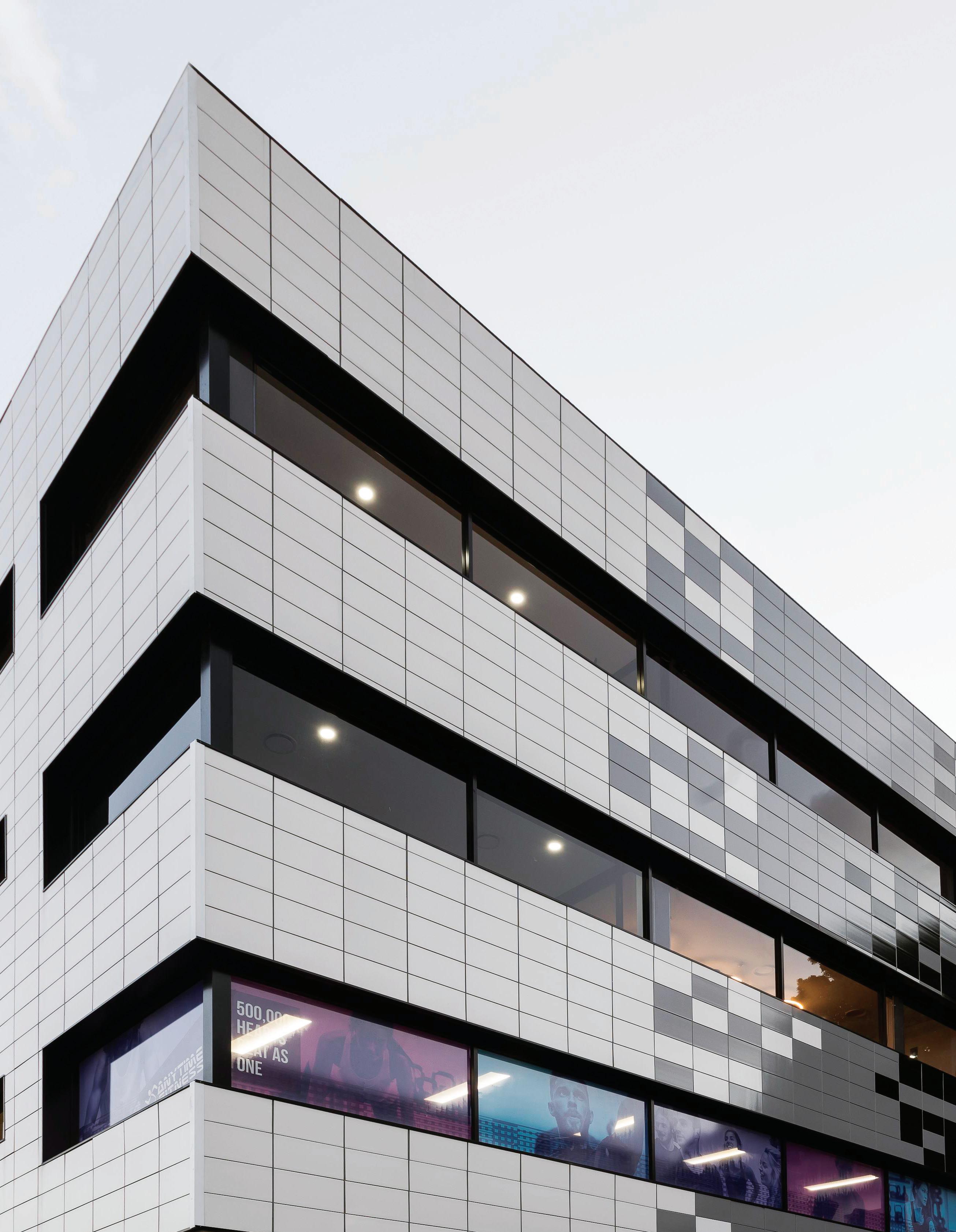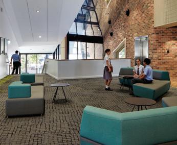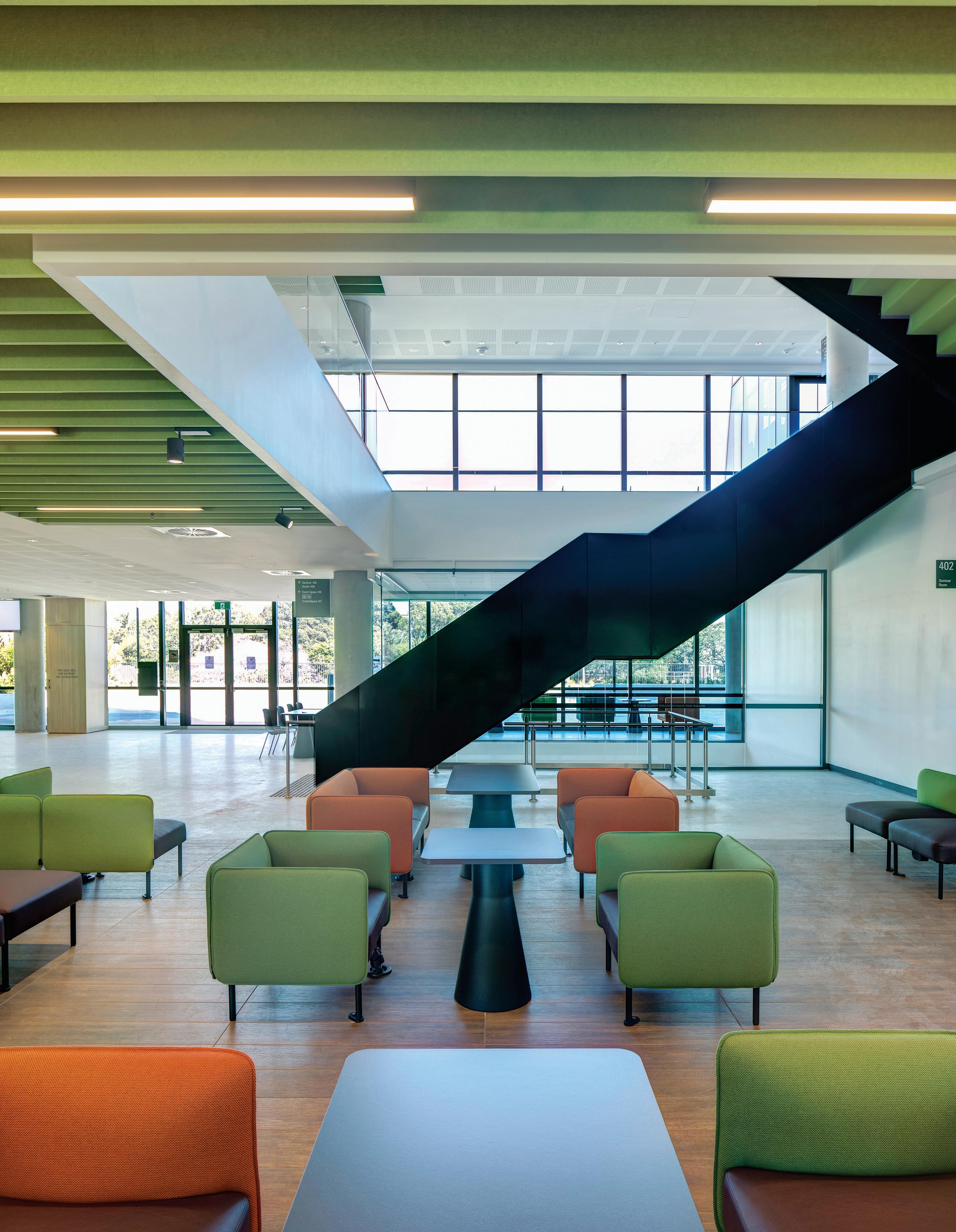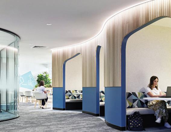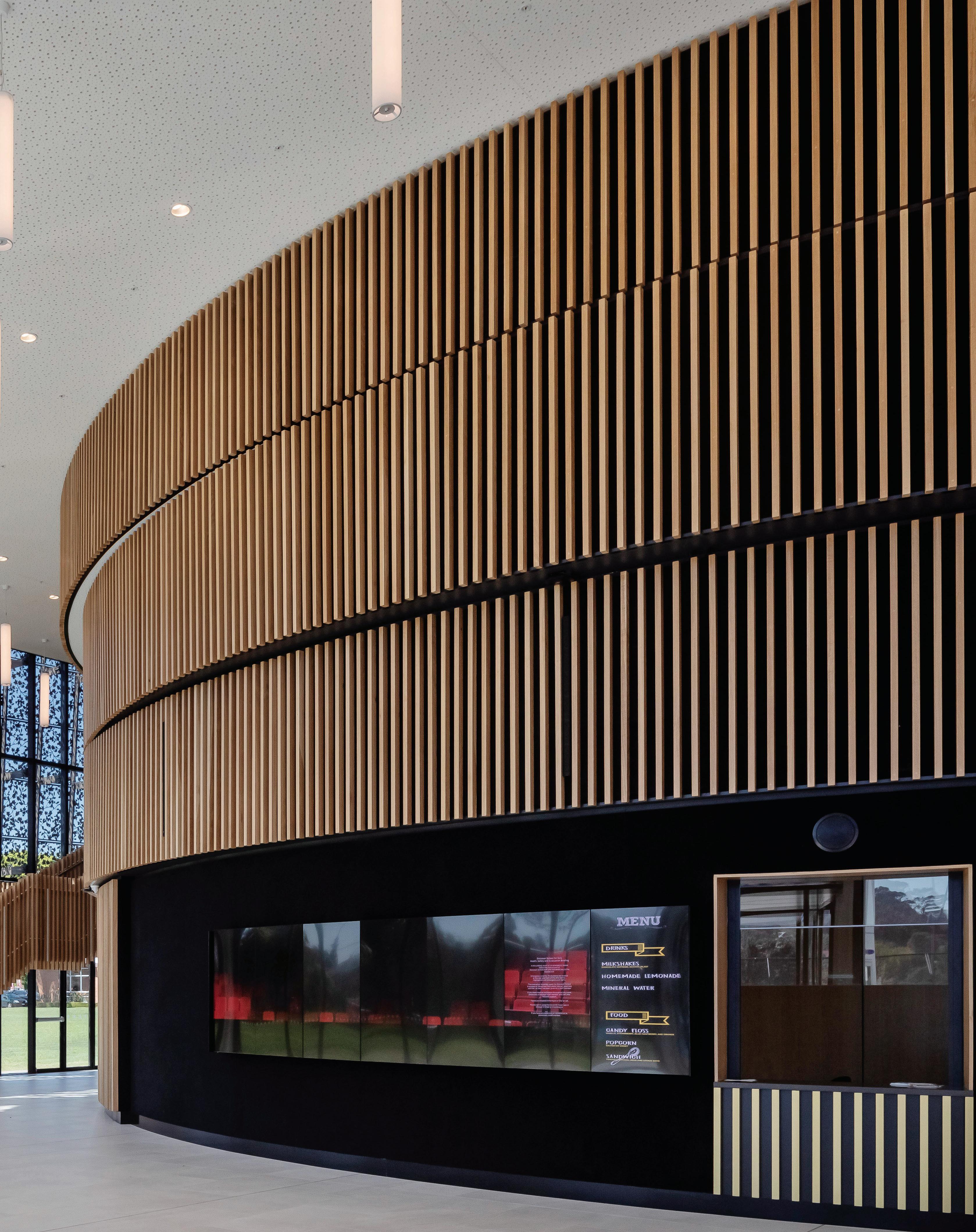 External – precast concrete, Bianco Precast . Custom oval glazed ceramic tiles, Inax Internal – ceiling and wall linings, Barestone, Cemintel Timber flooring, Victorian Ash, George Fethers. Resilient flooring and wall linings, Forbo. Acoustic Ecoustic Wall Linings, Instyle. Custom wall linings, ceilings and built-in joinery upholstery, Kvadrat Maharam . Carpet throughout, Urban Retreat, Interface