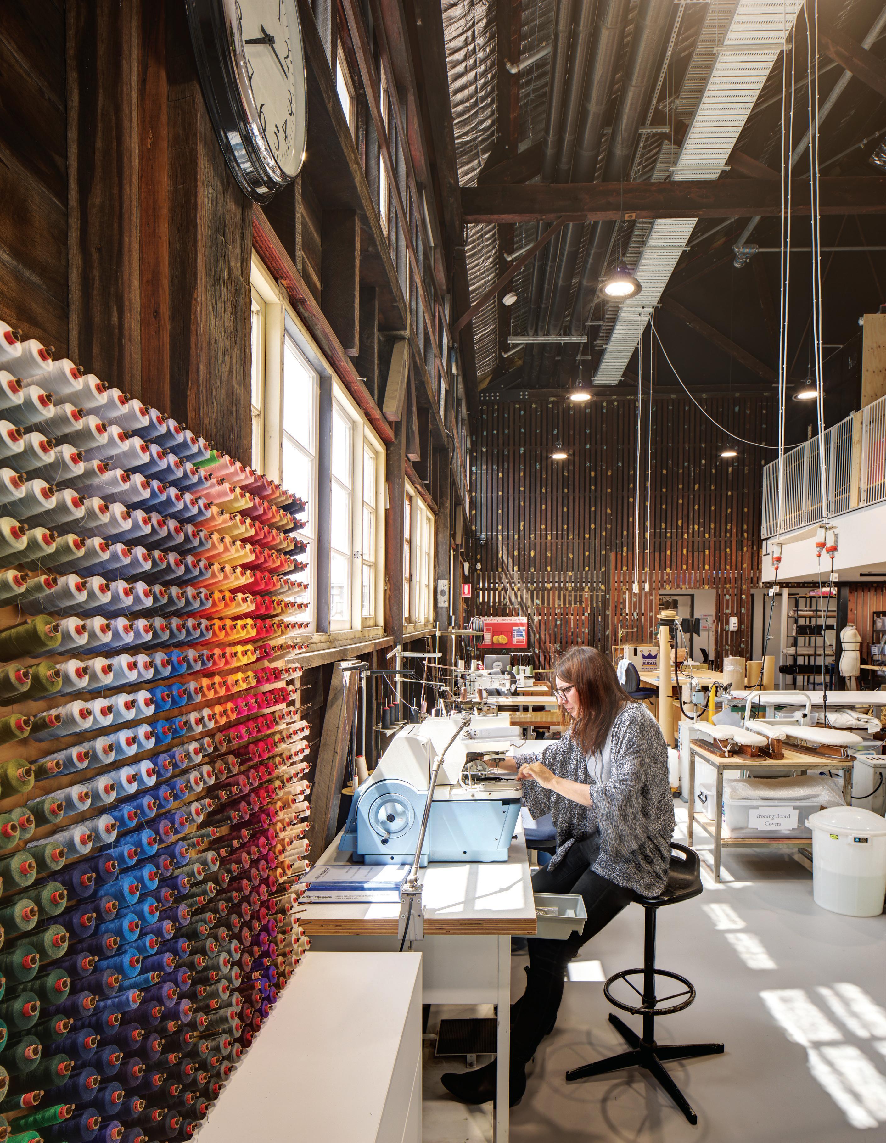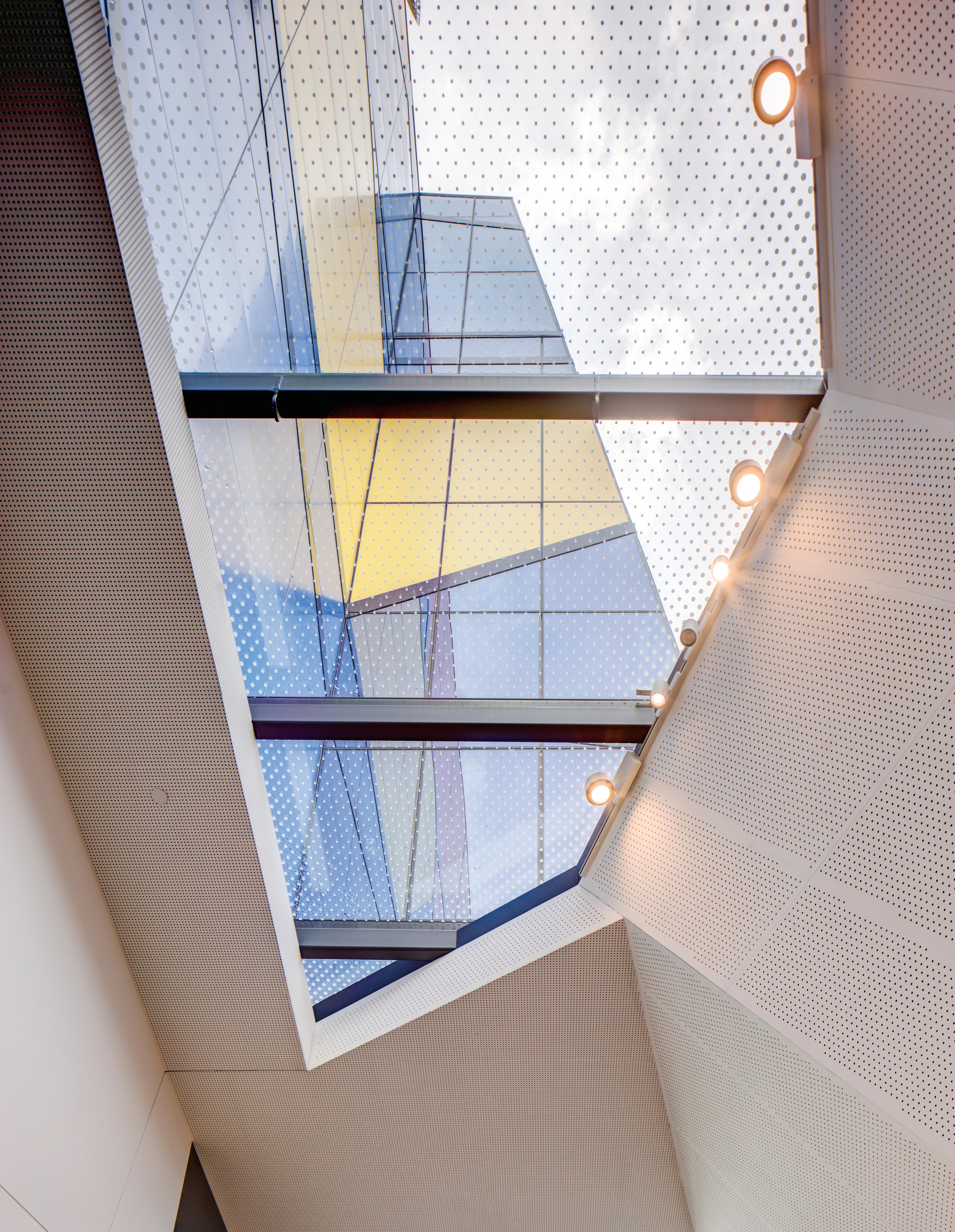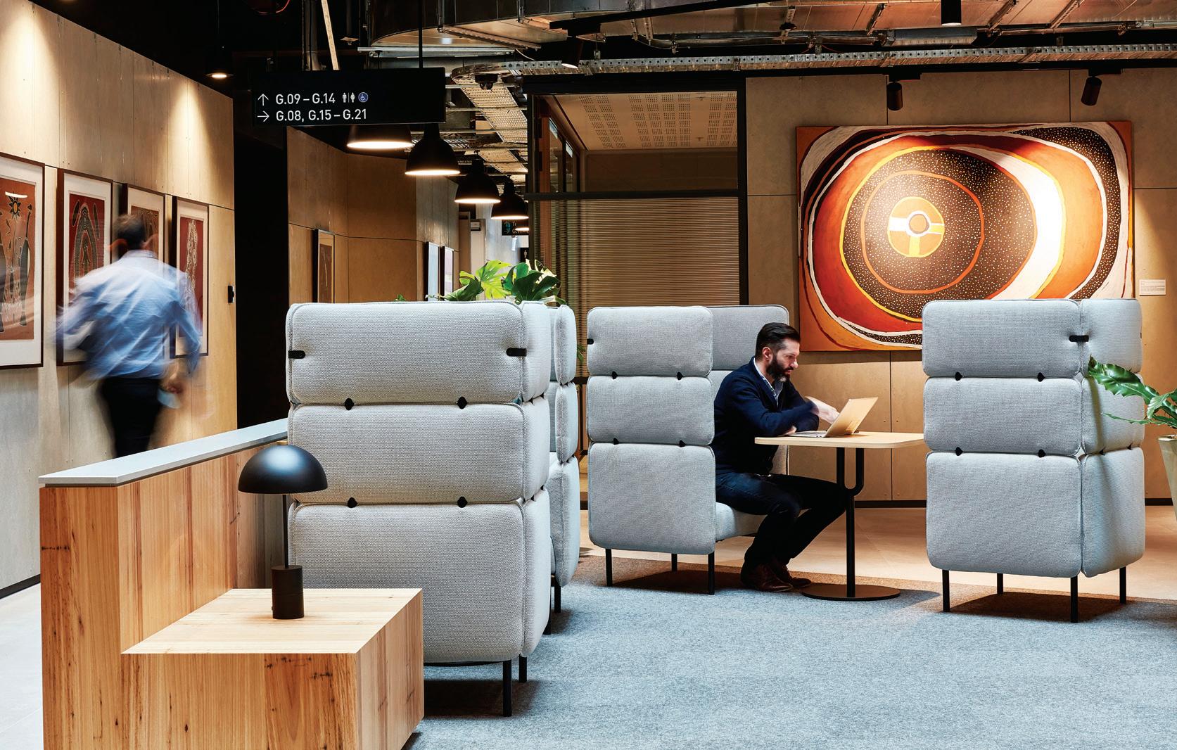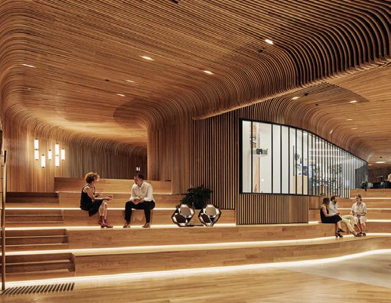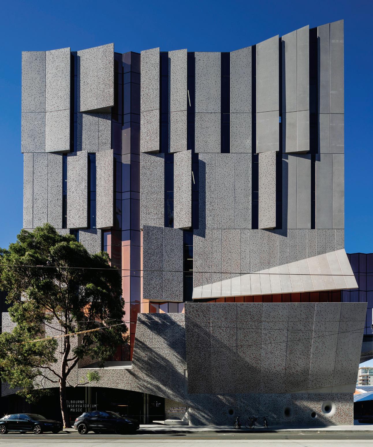 External – precast concrete, Bianco Precast . Custom oval glazed ceramic tiles, Inax Internal – ceiling and wall linings, Barestone, Cemintel Timber flooring, Victorian Ash, George Fethers. Resilient flooring and wall linings, Forbo. Acoustic Ecoustic Wall Linings, Instyle. Custom wall linings, ceilings and built-in joinery upholstery, Kvadrat Maharam . Carpet throughout, Urban Retreat, Interface