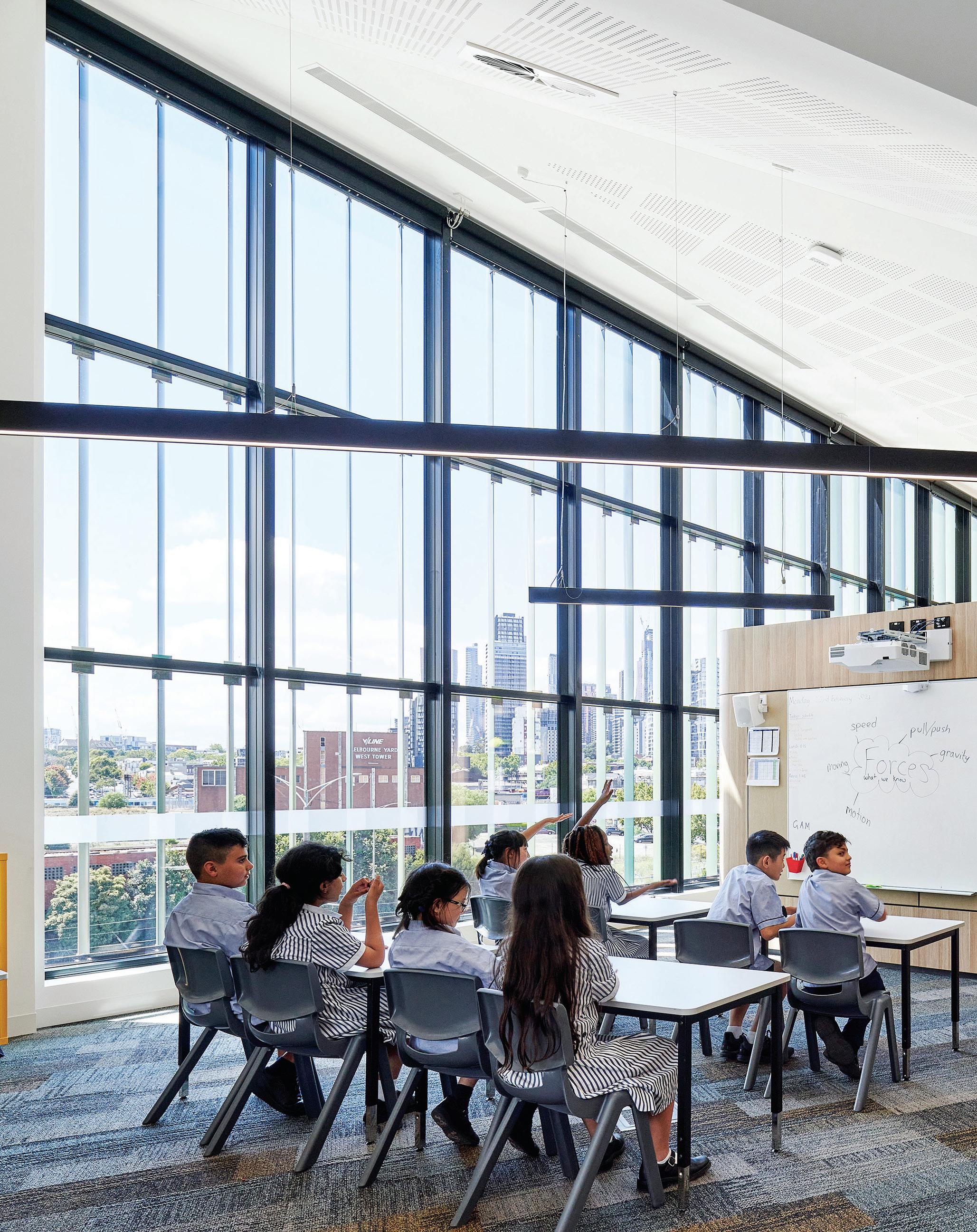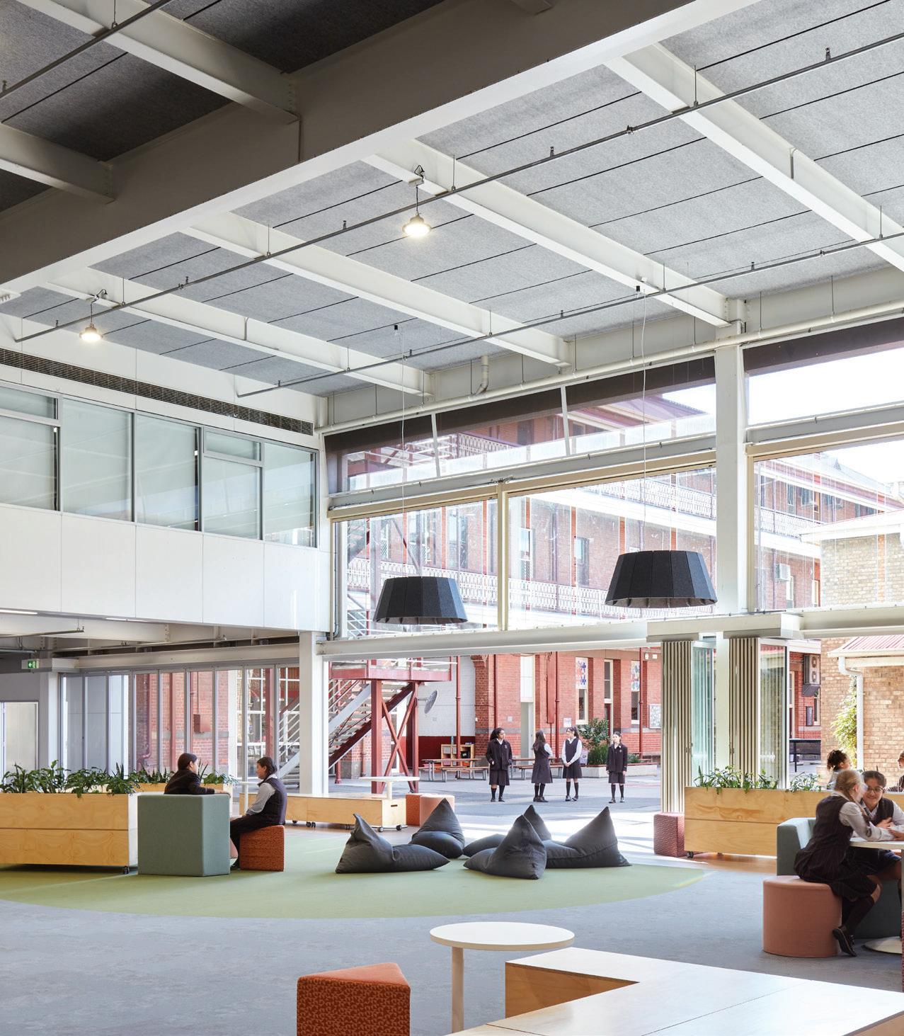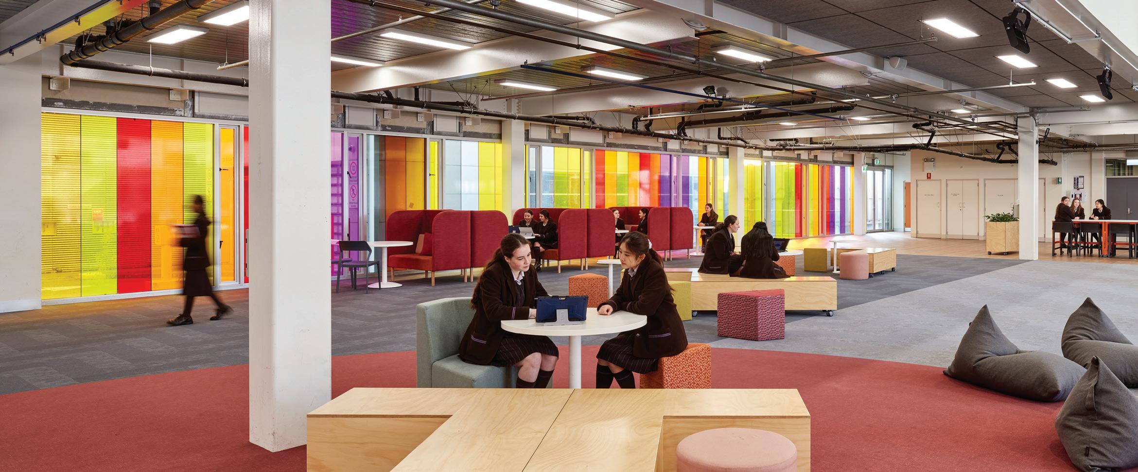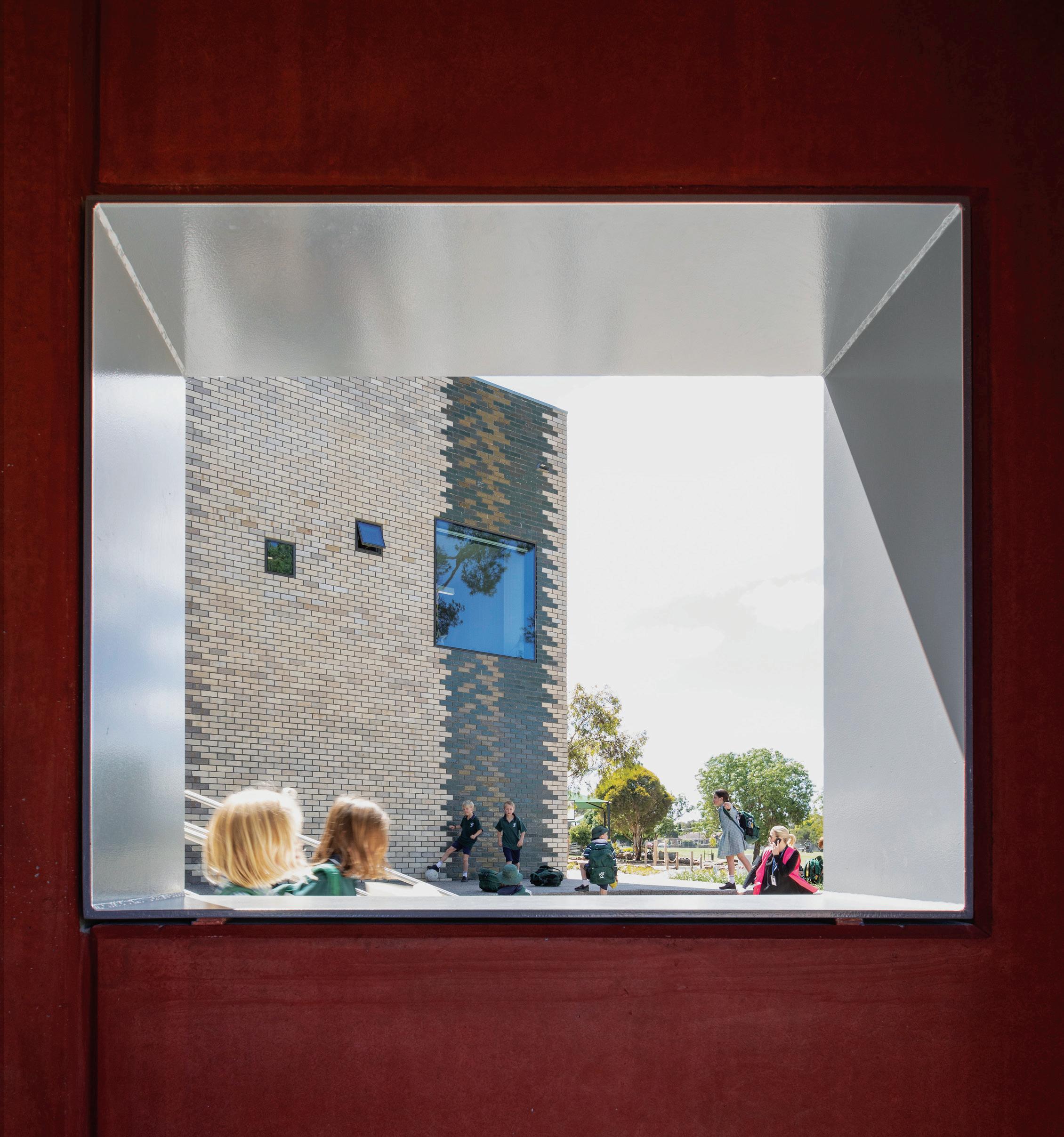 Brickwork throughout, Krause Bricks . Cladding, Equitone . Steel roofing, Bluescope . Vinyl marmoleum flooring, Forbo. Victorian Ash lining and floorboards, MPR . Urban Retreat standard (classrooms) and custom design (hall) carpet flooring, Interface . Ecoustic/ Curve acoustic panels, Instyle . Victorian Ash timber veneer, George Fethers Wood Wool acoustic ceilings to classrooms, Knauf Laminate finishes, Laminex, Abet Laminati
