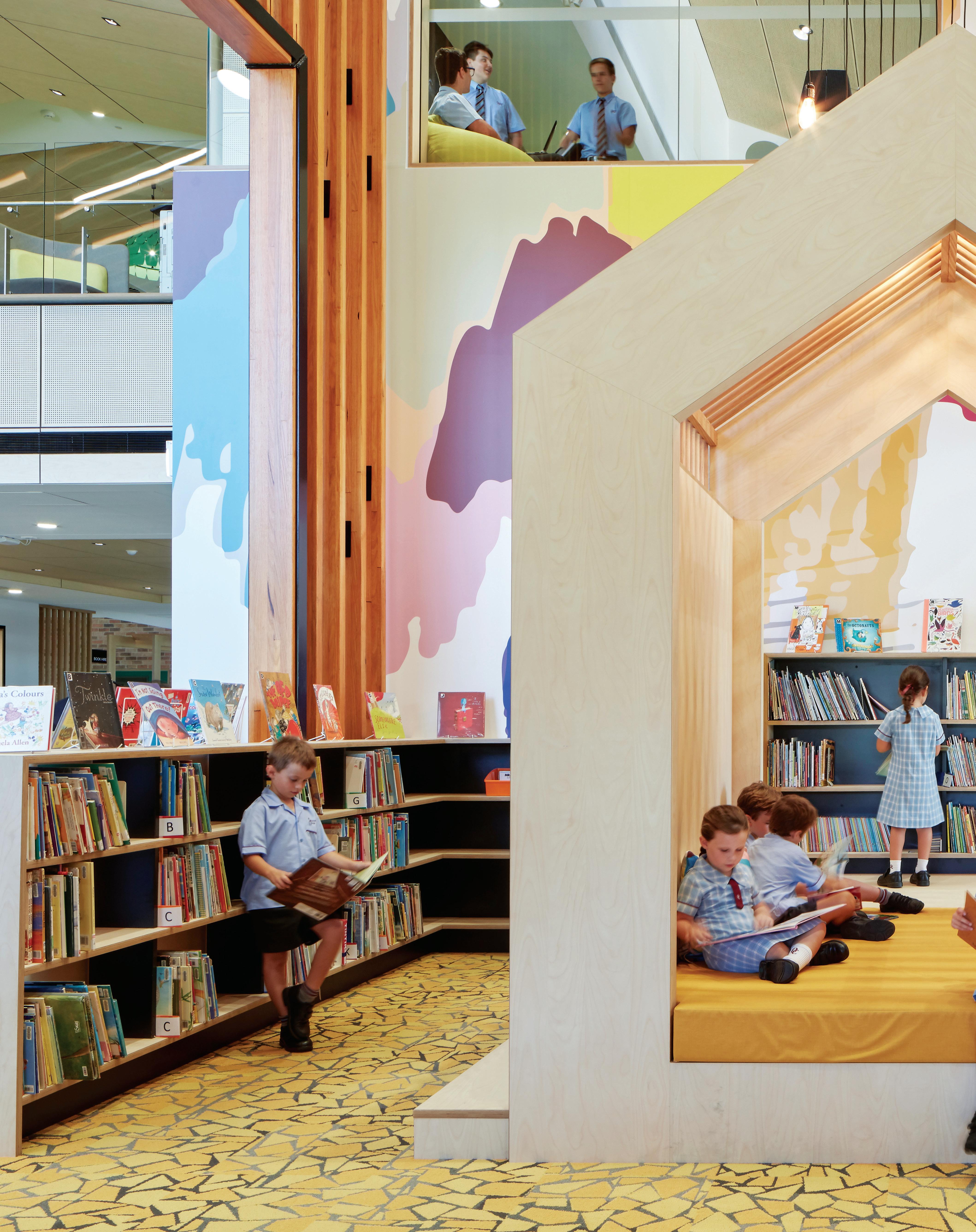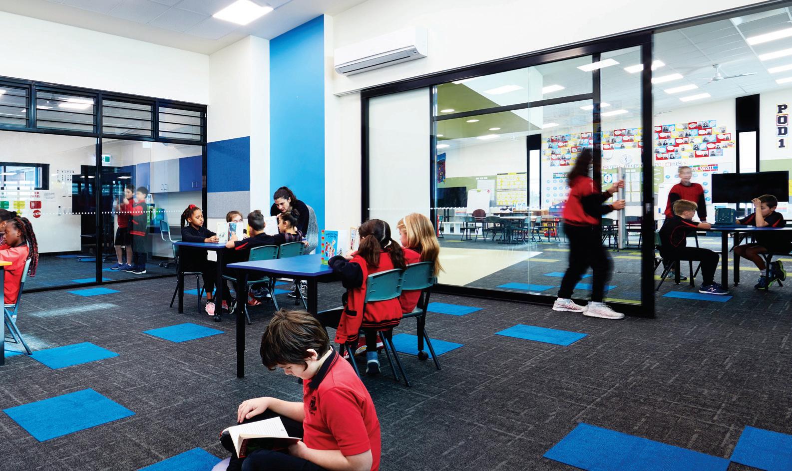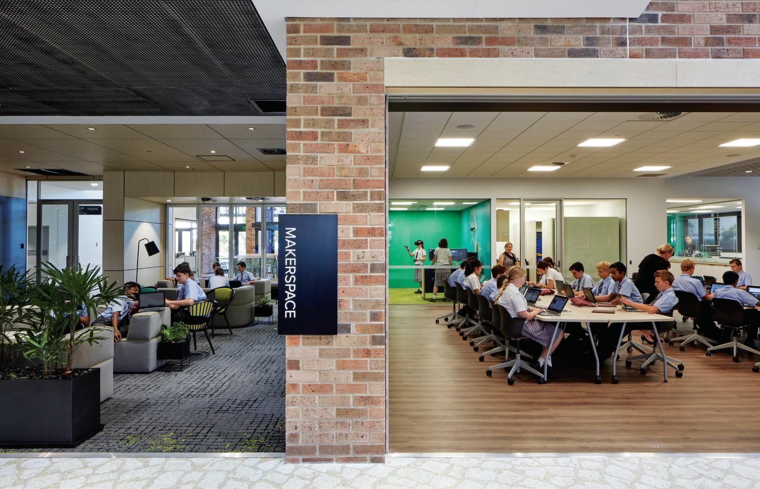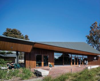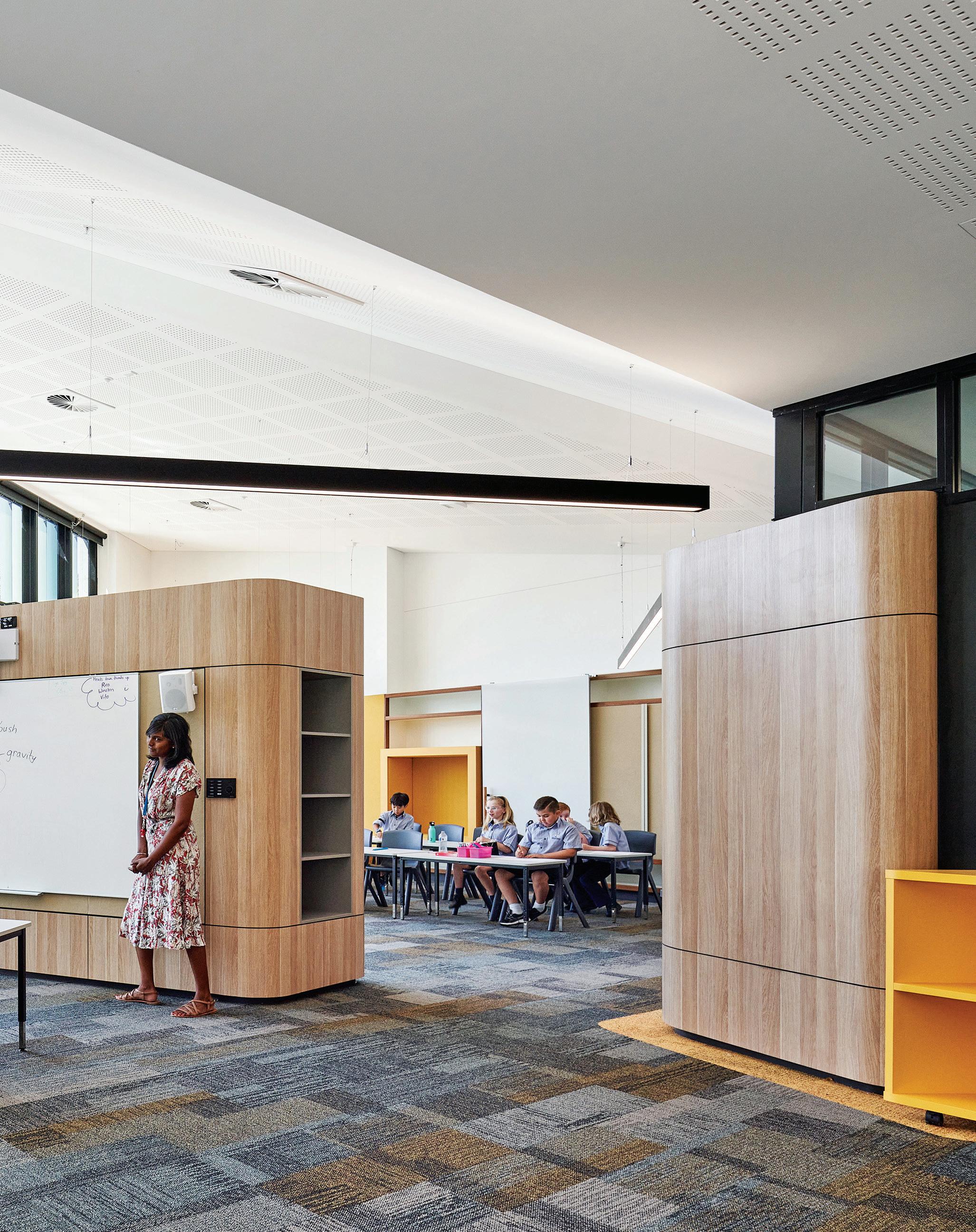 Brickwork throughout, Krause Bricks . Cladding, Equitone . Steel roofing, Bluescope . Vinyl marmoleum flooring, Forbo. Victorian Ash lining and floorboards, MPR . Urban Retreat standard (classrooms) and custom design (hall) carpet flooring, Interface . Ecoustic/ Curve acoustic panels, Instyle . Victorian Ash timber veneer, George Fethers Wood Wool acoustic ceilings to classrooms, Knauf Laminate finishes, Laminex, Abet Laminati