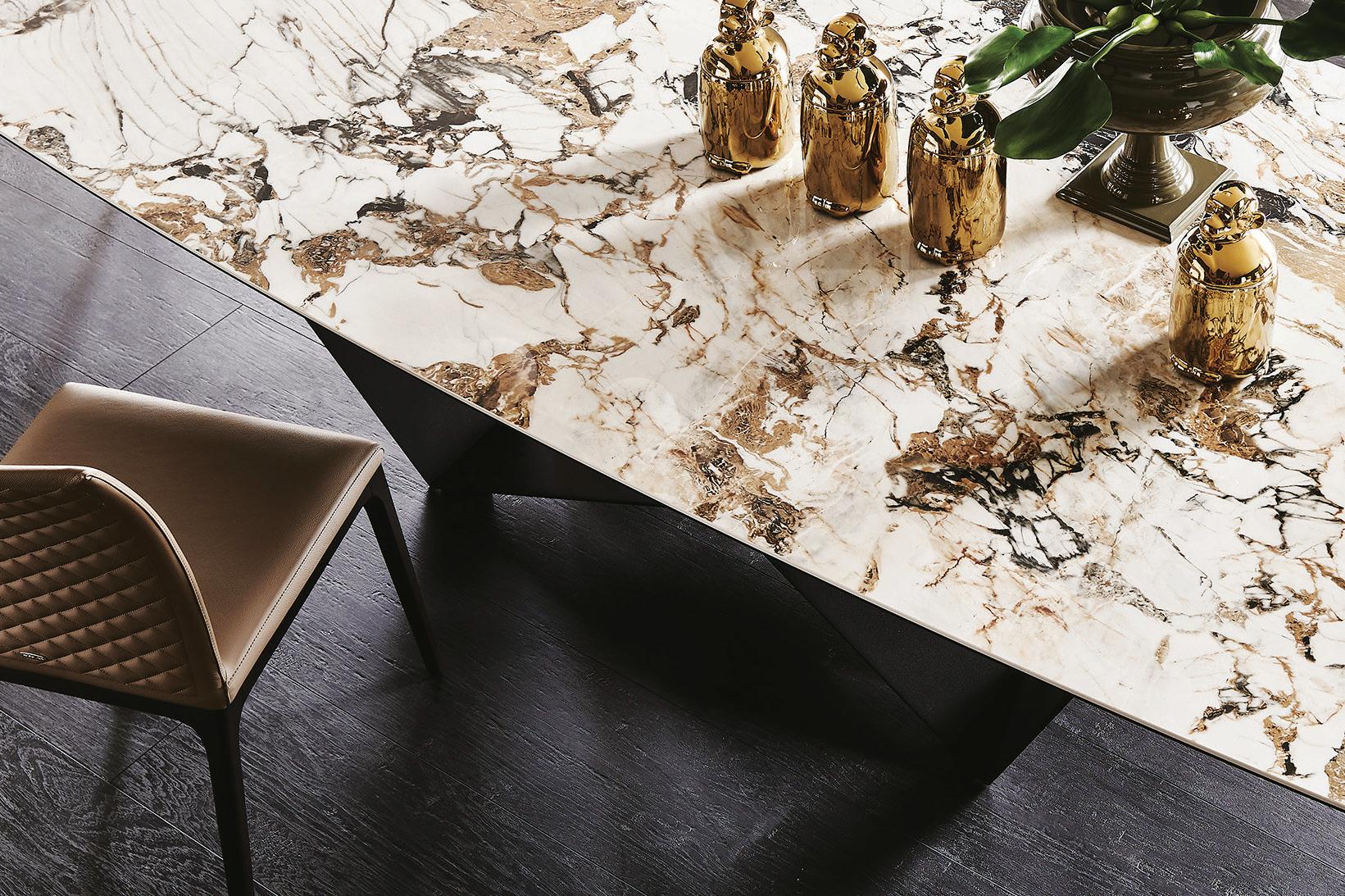 Table fully cladded with Calacatta Luxe, Ultrasoft finish.
